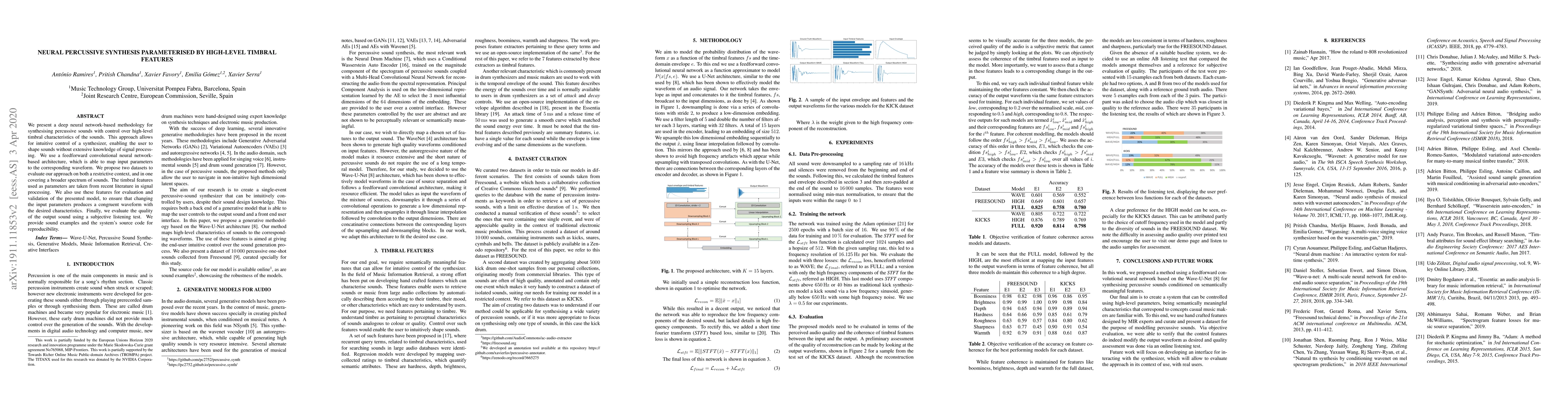 Researchers developed a neural network-based system to generate percussive sounds with intuitive control over timbral characteristics, using high-level features for parameterization.