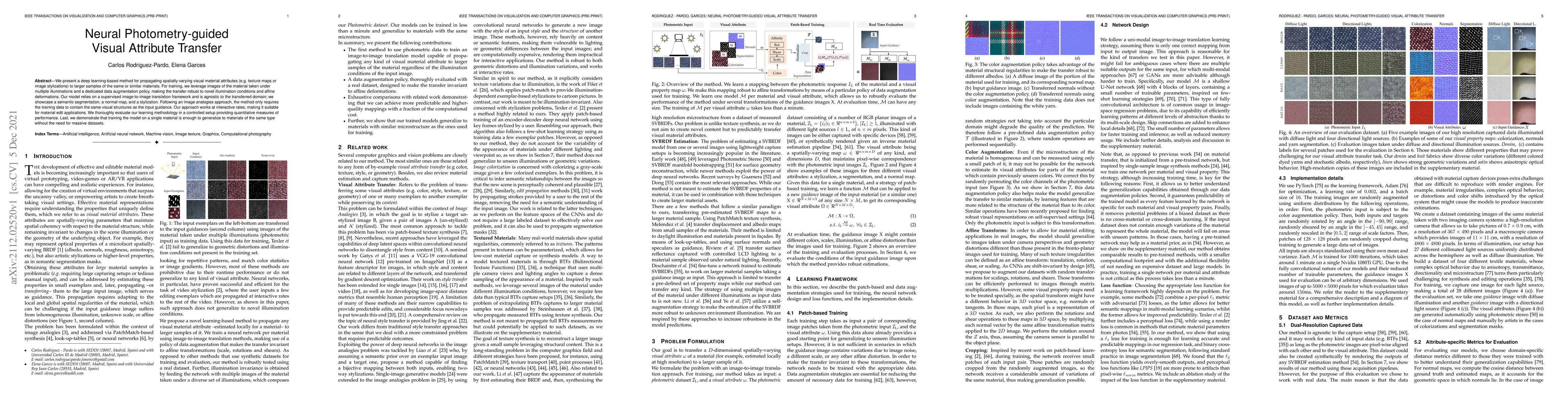 We present a deep learning-based method for propagating spatially-varying visual material attributes (e.g. texture maps or image stylizations) to larger samples of the same or similar materials. For training, we leverage images of the material taken under multiple illuminations and a dedicated data augmentation policy, making the transfer robust to novel illumination conditions and affine deformations. Our model relies on a supervised image-to-image translation framework and is agnostic to the transferred domain; we showcase a semantic segmentation, a normal map, and a stylization. Following an image analogies approach, the method only requires the training data to contain the same visual structures as the input guidance. Our approach works at interactive rates, making it suitable for material edit applications. We thoroughly evaluate our learning methodology in a controlled setup providing quantitative measures of performance. Last, we demonstrate that training the model on a single material is enough to generalize to materials of the same type without the need for massive datasets.