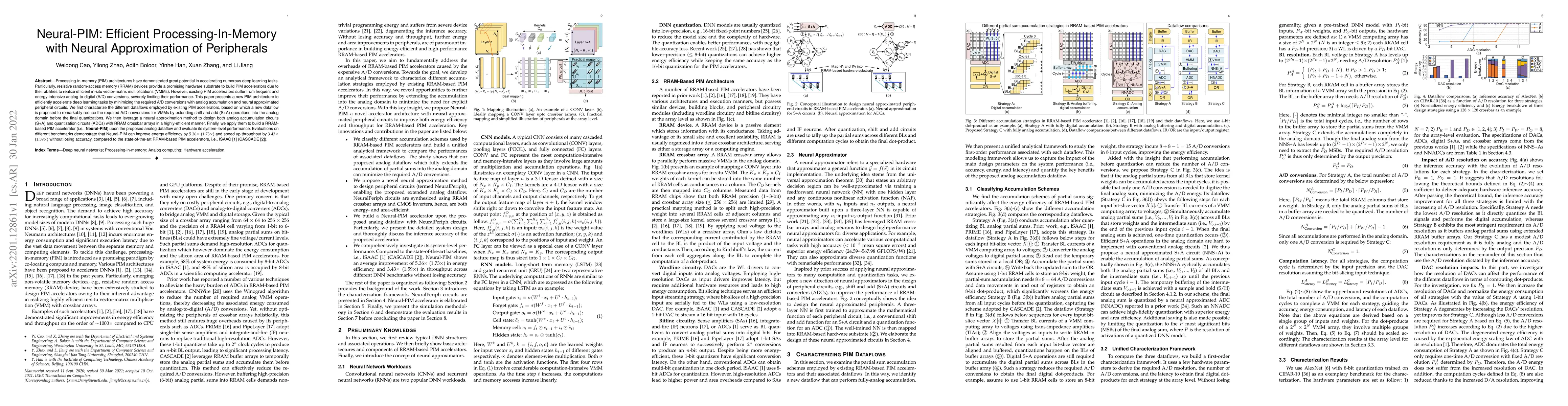 This paper introduces Neural-PIM, a novel processing-in-memory architecture that minimizes analog-to-digital conversions for efficient deep learning tasks by leveraging analog accumulation and neural approximated peripheral circuits. The proposed architecture significantly enhances energy efficiency and throughput by extending shift and add operations into the analog domain before quantization.