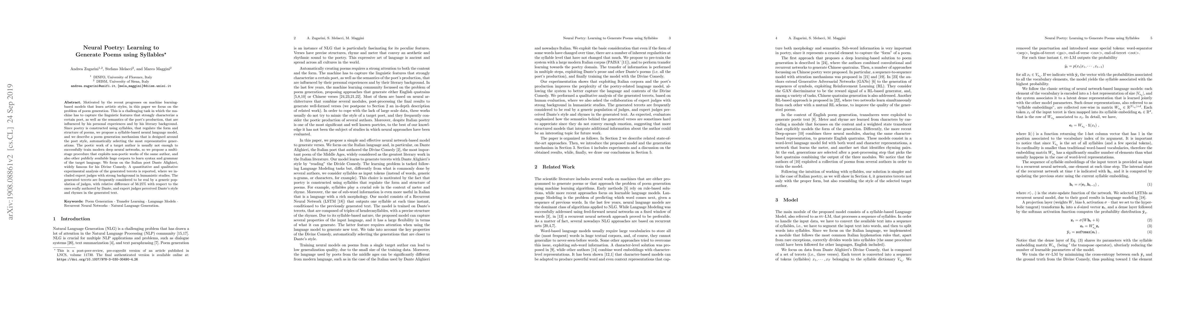 Motivated by the recent progresses on machine learning-based models that learn artistic styles, in this paper we focus on the problem of poem generation. This is a challenging task in which the machine has to capture the linguistic features that strongly characterize a certain poet, as well as the semantics of the poet's production, that are influenced by his personal experiences and by his literary background. Since poetry is constructed using syllables, that regulate the form and structure of poems, we propose a syllable-based neural language model, and we describe a poem generation mechanism that is designed around the poet style, automatically selecting the most representative generations. The poetic work of a target author is usually not enough to successfully train modern deep neural networks, so we propose a multi-stage procedure that exploits non-poetic works of the same author, and also other publicly available huge corpora to learn syntax and grammar of the target language. We focus on the Italian poet Dante Alighieri, widely famous for his Divine Comedy. A quantitative and qualitative experimental analysis of the generated tercets is reported, where we included expert judges with strong background in humanistic studies. The generated tercets are frequently considered to be real by a generic population of judges, with relative difference of 56.25\% with respect to the ones really authored by Dante, and expert judges perceived Dante's style and rhymes in the generated text.