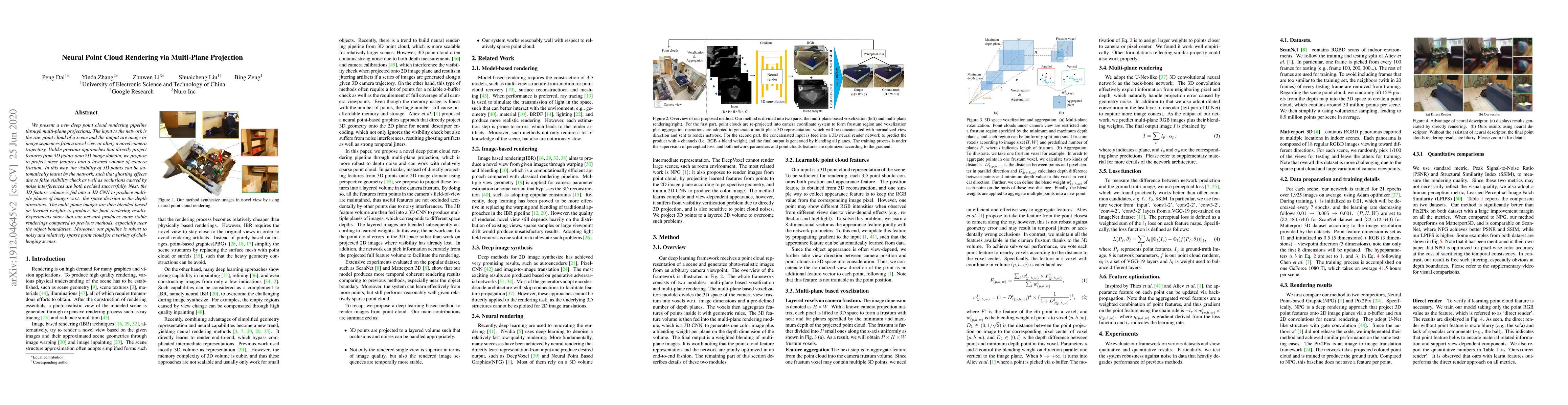 We present a new deep point cloud rendering pipeline through multi-plane projections. The input to the network is the raw point cloud of a scene and the output are image or image sequences from a novel view or along a novel camera trajectory. Unlike previous approaches that directly project features from 3D points onto 2D image domain, we propose to project these features into a layered volume of camera frustum. In this way, the visibility of 3D points can be automatically learnt by the network, such that ghosting effects due to false visibility check as well as occlusions caused by noise interferences are both avoided successfully. Next, the 3D feature volume is fed into a 3D CNN to produce multiple layers of images w.r.t. the space division in the depth directions. The layered images are then blended based on learned weights to produce the final rendering results. Experiments show that our network produces more stable renderings compared to previous methods, especially near the object boundaries. Moreover, our pipeline is robust to noisy and relatively sparse point cloud for a variety of challenging scenes.