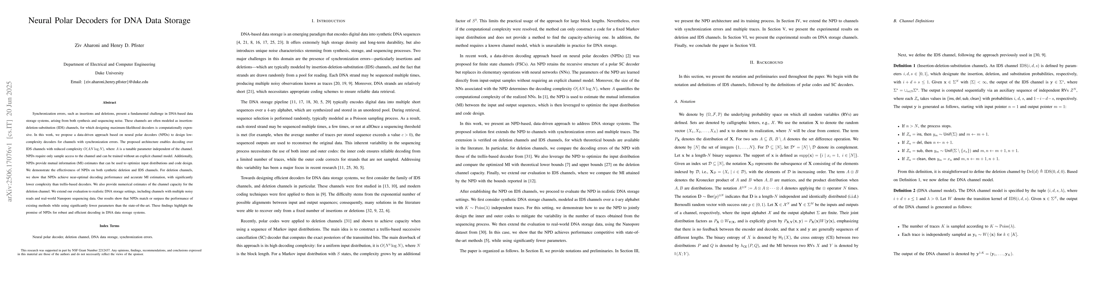Synchronization errors, such as insertions and deletions, present a fundamental challenge in DNA-based data storage systems, arising from both synthesis and sequencing noise. These channels are often modeled as insertion-deletion-substitution (IDS) channels, for which designing maximum-likelihood decoders is computationally expensive. In this work, we propose a data-driven approach based on neural polar decoders (NPDs) to design low-complexity decoders for channels with synchronization errors. The proposed architecture enables decoding over IDS channels with reduced complexity $O(AN log N )$, where $A$ is a tunable parameter independent of the channel. NPDs require only sample access to the channel and can be trained without an explicit channel model. Additionally, NPDs provide mutual information (MI) estimates that can be used to optimize input distributions and code design. We demonstrate the effectiveness of NPDs on both synthetic deletion and IDS channels. For deletion channels, we show that NPDs achieve near-optimal decoding performance and accurate MI estimation, with significantly lower complexity than trellis-based decoders. We also provide numerical estimates of the channel capacity for the deletion channel. We extend our evaluation to realistic DNA storage settings, including channels with multiple noisy reads and real-world Nanopore sequencing data. Our results show that NPDs match or surpass the performance of existing methods while using significantly fewer parameters than the state-of-the-art. These findings highlight the promise of NPDs for robust and efficient decoding in DNA data storage systems.
