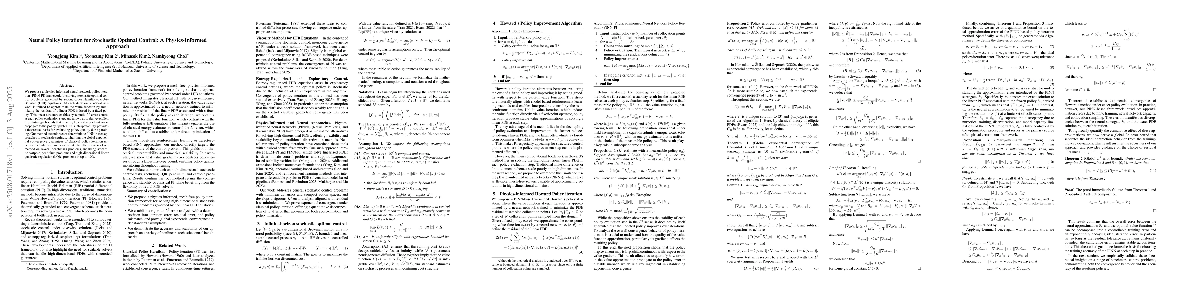 We propose a physics-informed neural network policy iteration (PINN-PI) framework for solving stochastic optimal control problems governed by second-order Hamilton--Jacobi--Bellman (HJB) equations. At each iteration, a neural network is trained to approximate the value function by minimizing the residual of a linear PDE induced by a fixed policy. This linear structure enables systematic $L^2$ error control at each policy evaluation step, and allows us to derive explicit Lipschitz-type bounds that quantify how value gradient errors propagate to the policy updates. This interpretability provides a theoretical basis for evaluating policy quality during training. Our method extends recent deterministic PINN-based approaches to stochastic settings, inheriting the global exponential convergence guarantees of classical policy iteration under mild conditions. We demonstrate the effectiveness of our method on several benchmark problems, including stochastic cartpole, pendulum problems and high-dimensional linear quadratic regulation (LQR) problems in up to 10D.