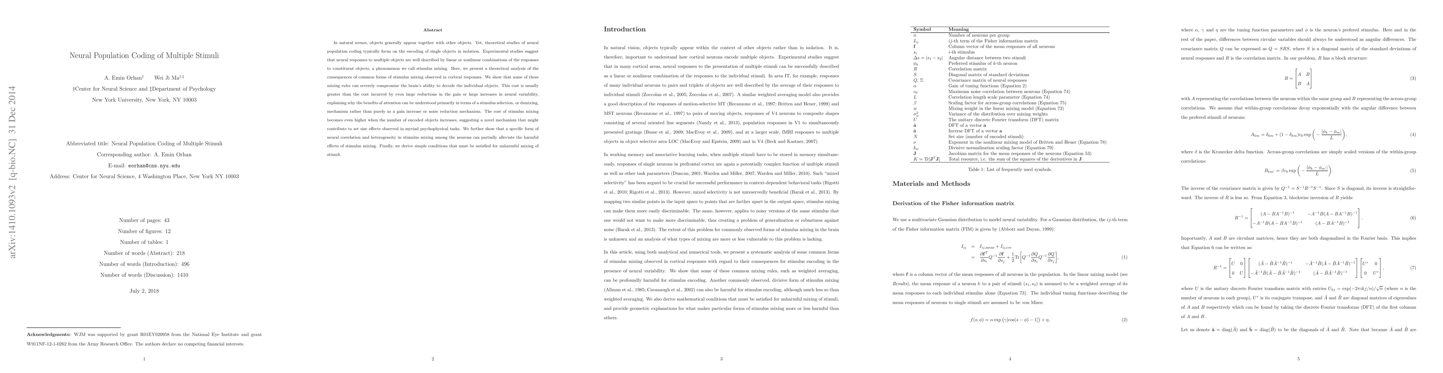 In natural scenes, objects generally appear together with other objects. Yet, theoretical studies of neural population coding typically focus on the encoding of single objects in isolation. Experimental studies suggest that neural responses to multiple objects are well described by linear or nonlinear combinations of the responses to constituent objects, a phenomenon we call stimulus mixing. Here, we present a theoretical analysis of the consequences of common forms of stimulus mixing observed in cortical responses. We show that some of these mixing rules can severely compromise the brain's ability to decode the individual objects. This cost is usually greater than the cost incurred by even large reductions in the gain or large increases in neural variability, explaining why the benefits of attention can be understood primarily in terms of a stimulus selection, or demixing, mechanism rather than purely as a gain increase or noise reduction mechanism. The cost of stimulus mixing becomes even higher when the number of encoded objects increases, suggesting a novel mechanism that might contribute to set size effects observed in myriad psychophysical tasks. We further show that a specific form of neural correlation and heterogeneity in stimulus mixing among the neurons can partially alleviate the harmful effects of stimulus mixing. Finally, we derive simple conditions that must be satisfied for unharmful mixing of stimuli.