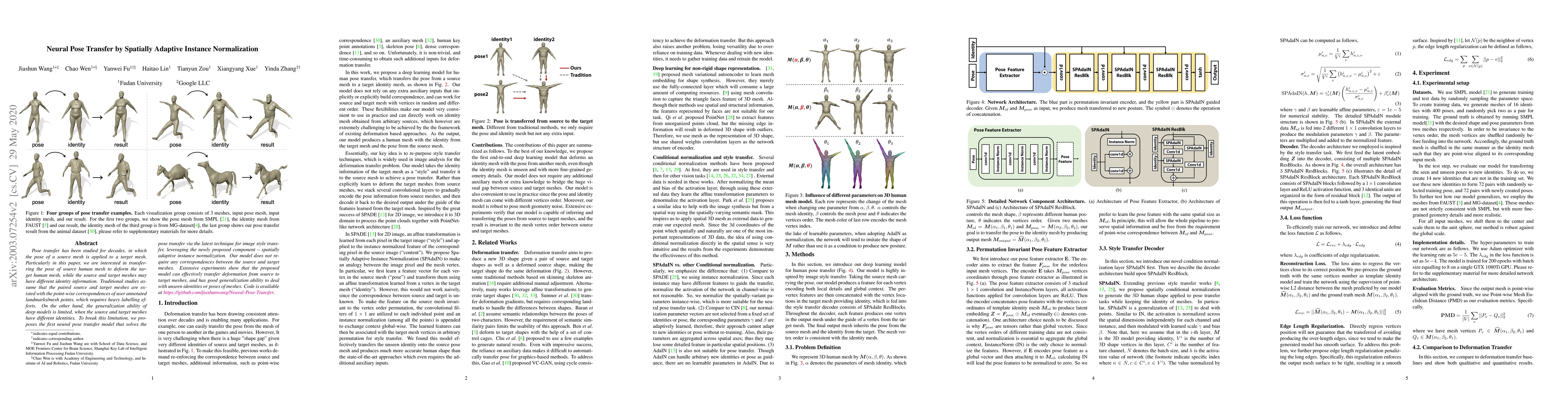 This paper introduces a neural pose transfer model that uses spatially adaptive instance normalization to transfer poses between human meshes without requiring correspondences, demonstrating effective deformation transfer and generalization to unseen identities and poses. The model's code is available for further exploration.