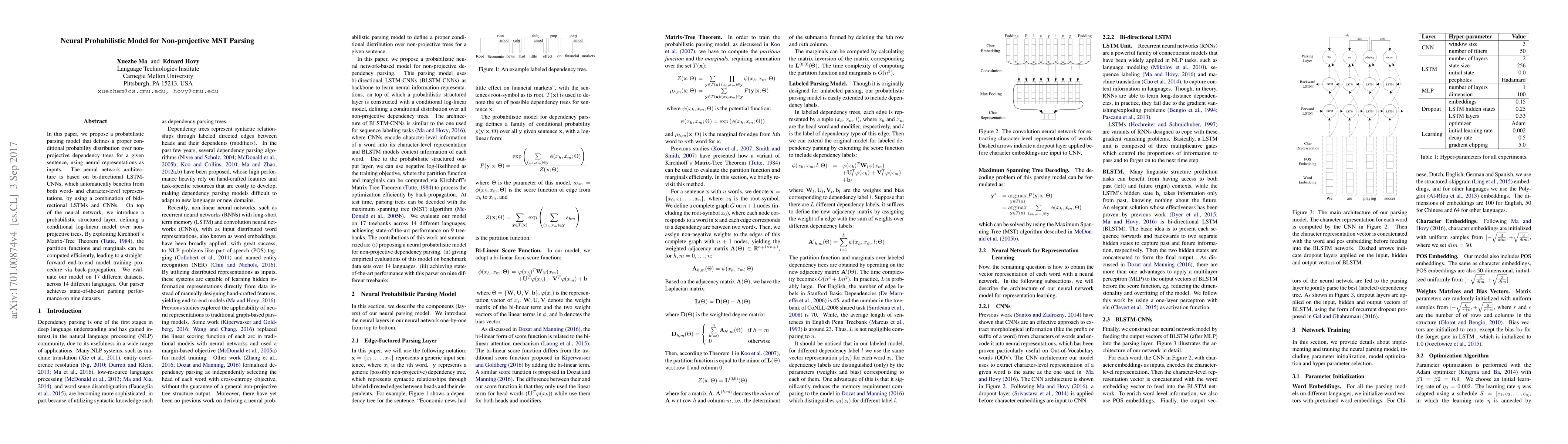 This paper introduces a neural probabilistic model for parsing non-projective minimal spanning trees using bi-directional LSTM-CNNs for neural representations. The model achieves state-of-the-art performance on nine datasets across 14 languages by leveraging Kirchhoff's Matrix-Tree Theorem for efficient computation.