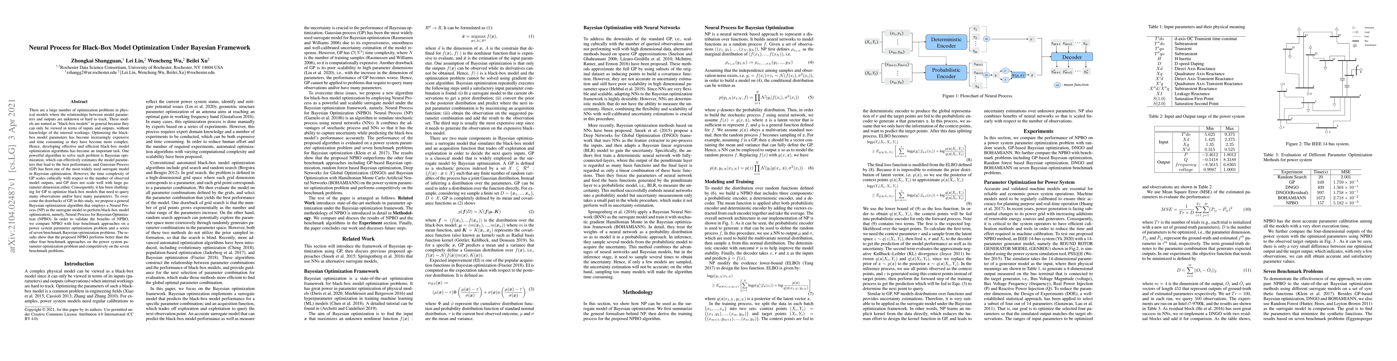 This paper proposes a Neural Process for Bayesian Optimization (NPBO) to efficiently optimize black-box models, addressing the scalability issues of Gaussian Processes. NPBO outperforms benchmark methods in a power system parameter optimization and several benchmark problems, demonstrating its effectiveness.