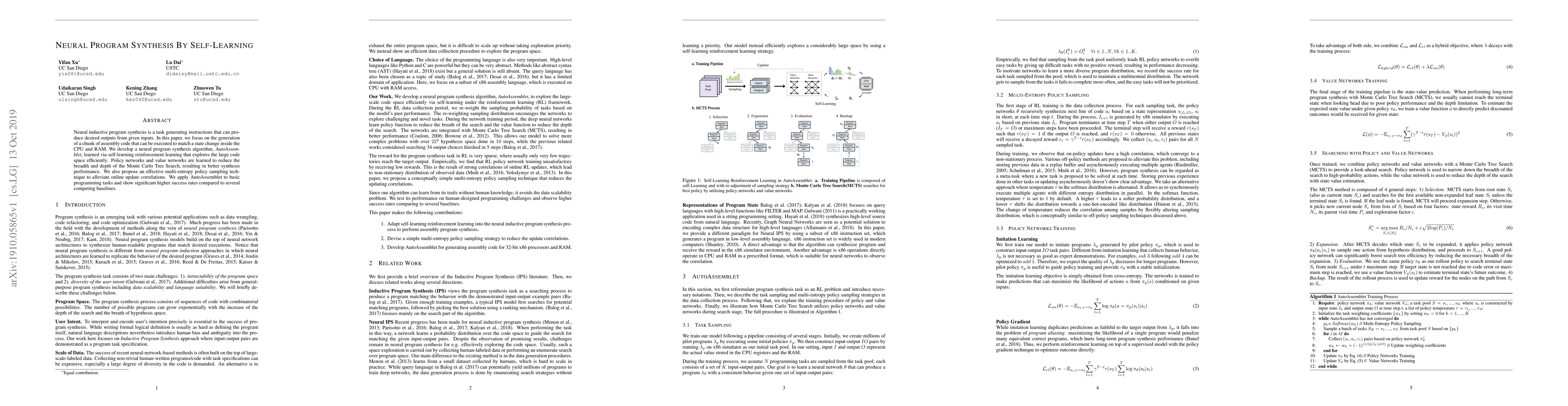 This paper introduces AutoAssemblet, a neural program synthesis algorithm that uses self-learning reinforcement learning to efficiently generate assembly code that achieves desired state changes in a CPU and RAM. It employs policy and value networks to improve Monte Carlo Tree Search and proposes a multi-entropy policy sampling technique to enhance performance, achieving higher success rates on basic programming tasks compared to baselines.