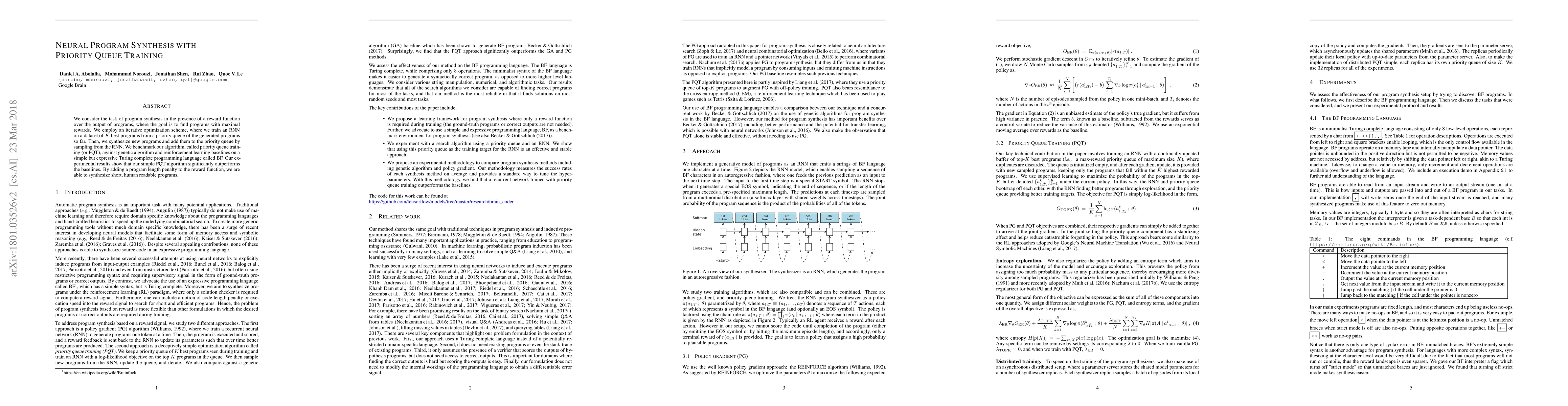 This paper proposes a neural program synthesis method called priority queue training (PQT), which iteratively optimizes an RNN using the K best programs from a priority queue. PQT outperforms genetic algorithms and reinforcement learning baselines in synthesizing optimal programs in BF language, and with a program length penalty, it generates short, readable programs.