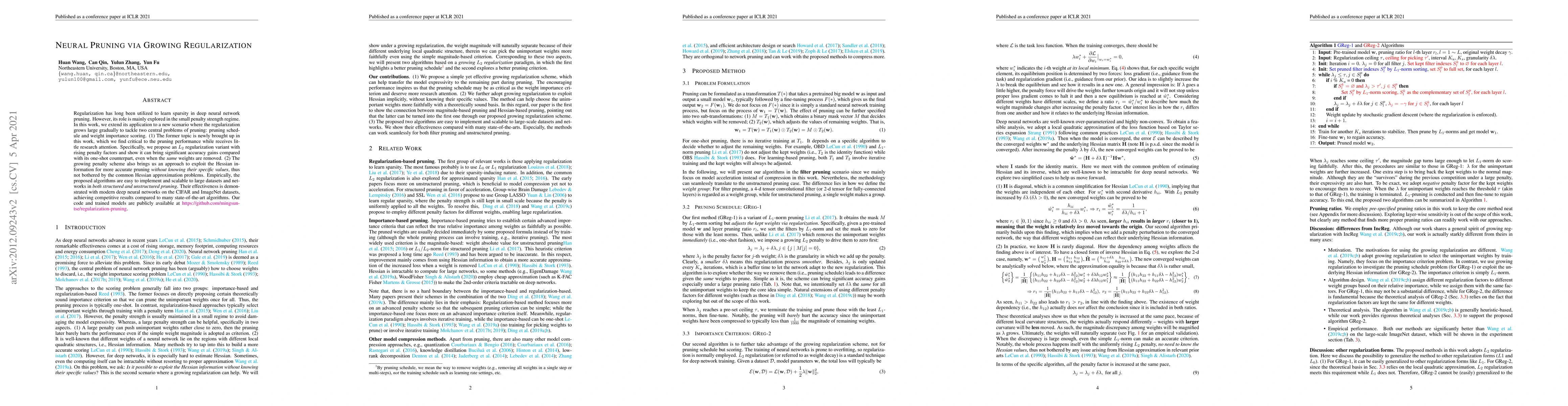 This paper proposes a novel neural pruning method using growing regularization to address the pruning schedule and weight importance scoring. It introduces an L2 regularization variant with increasing penalty factors, demonstrating significant accuracy gains and scalability, and achieves competitive results on CIFAR and ImageNet datasets.