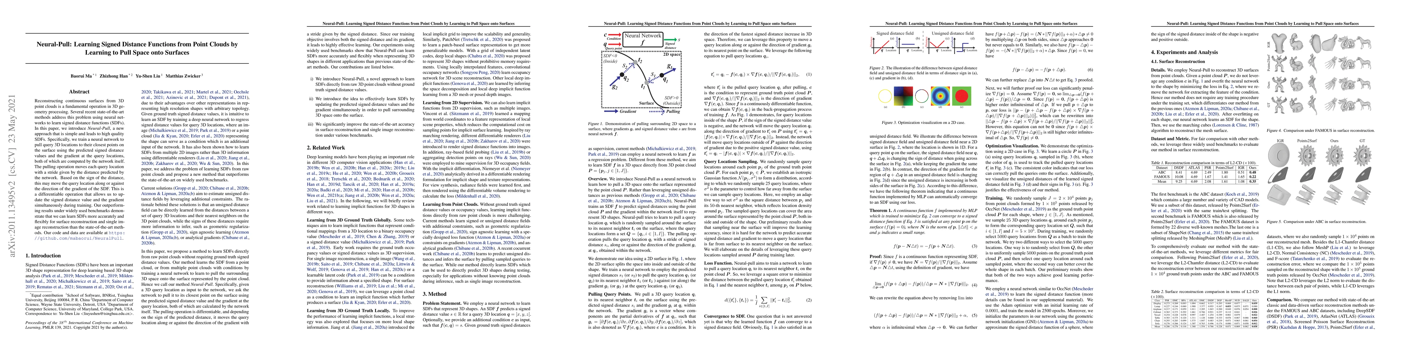 The paper introduces Neural-Pull, a novel neural network approach for reconstructing signed distance functions (SDFs) from 3D point clouds by training the network to "pull" query points towards their closest surface locations, enabling more accurate and flexible surface reconstruction compared to existing methods. The pulling operation, guided by predicted distance and gradient, is differentiable and allows simultaneous updates during training.