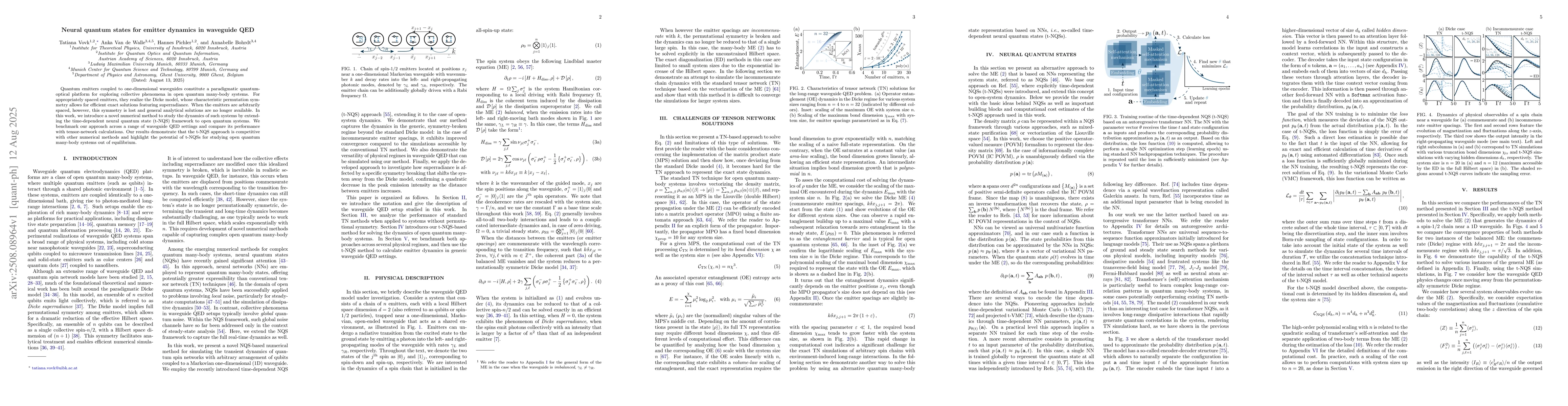 Quantum emitters coupled to one-dimensional waveguides constitute a paradigmatic quantum-optical platform for exploring collective phenomena in open quantum many-body systems. For appropriately spaced emitters, they realize the Dicke model, whose characteristic permutation symmetry allows for efficient exact solutions featuring superradiance. When the emitters are arbitrarily spaced, however, this symmetry is lost and general analytical solutions are no longer available. In this work, we introduce a novel numerical method to study the dynamics of such systems by extending the time-dependent neural quantum state (t-NQS) framework to open quantum systems. We benchmark our approach across a range of waveguide QED settings and compare its performance with tensor-network calculations. Our results demonstrate that the t-NQS approach is competitive with other numerical methods and highlight the potential of t-NQSs for studying open quantum many-body systems out of equilibrium.