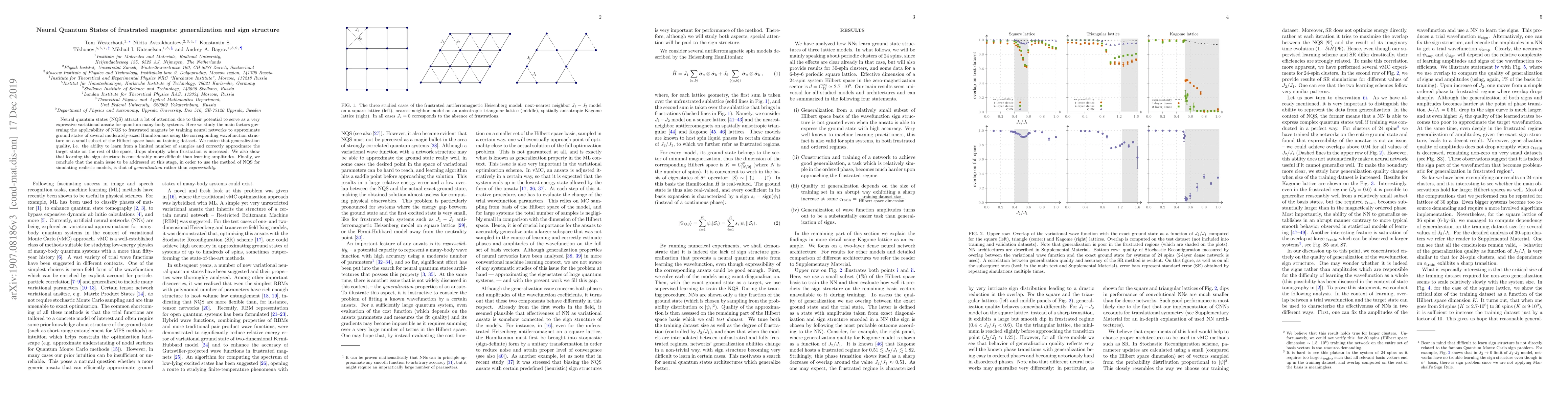 Researchers studied neural quantum states (NQS) for frustrated magnets, finding that generalization quality drops sharply with increasing frustration, and learning sign structure is harder than learning amplitudes.
