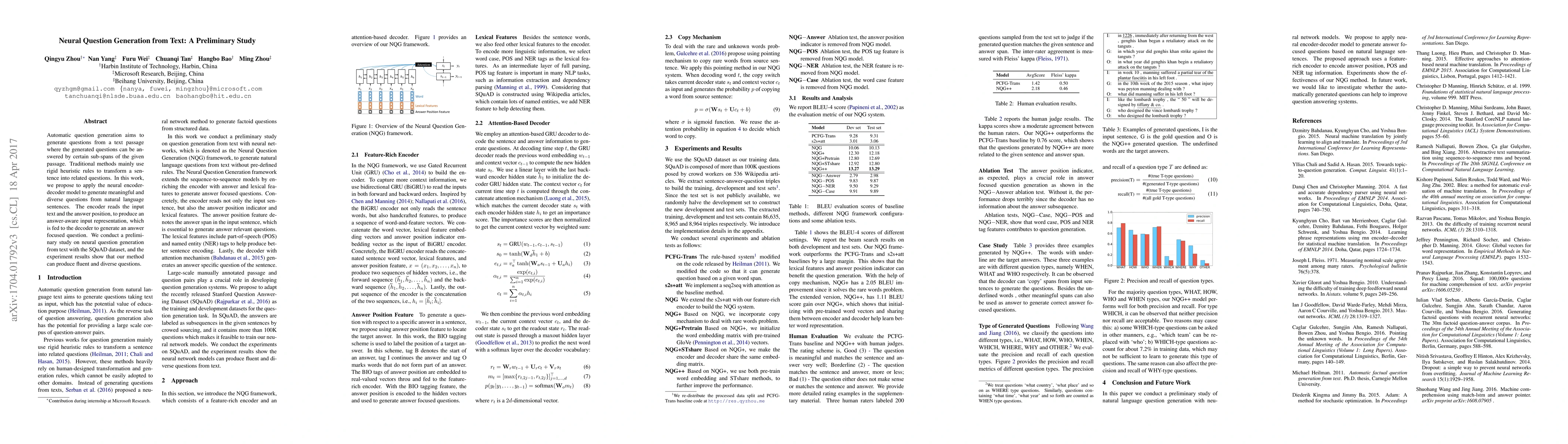 This paper proposes a neural encoder-decoder model for generating meaningful and diverse questions from text, using an answer-aware input representation. Preliminary experiments on the SQuAD dataset show that the method produces fluent and varied questions.