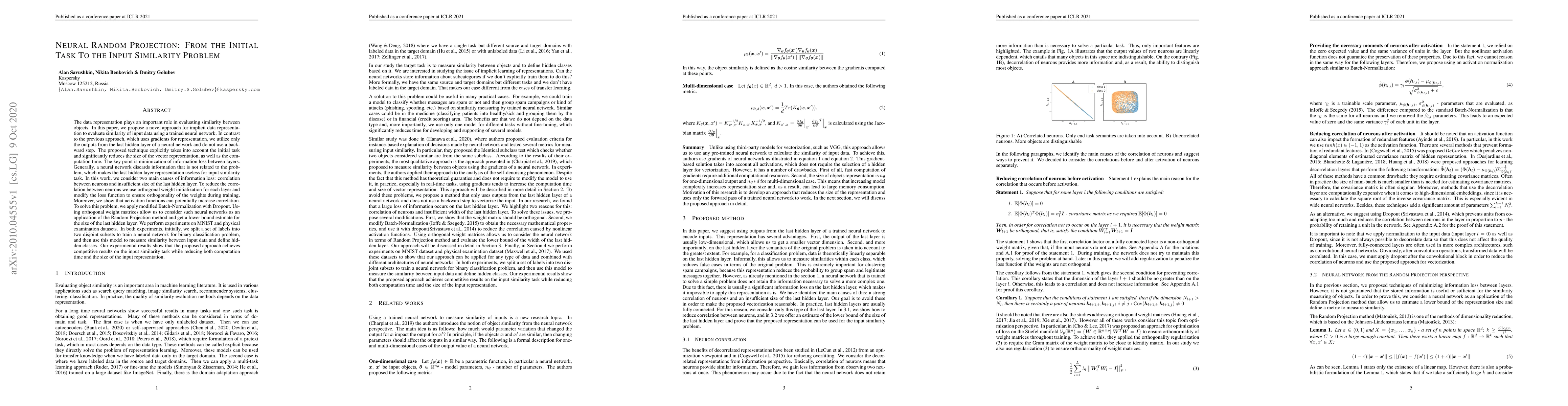 In this paper, we propose a novel approach for implicit data representation to evaluate similarity of input data using a trained neural network. In contrast to the previous approach, which uses gradients for representation, we utilize only the outputs from the last hidden layer of a neural network and do not use a backward step. The proposed technique explicitly takes into account the initial task and significantly reduces the size of the vector representation, as well as the computation time. The key point is minimization of information loss between layers. Generally, a neural network discards information that is not related to the problem, which makes the last hidden layer representation useless for input similarity task. In this work, we consider two main causes of information loss: correlation between neurons and insufficient size of the last hidden layer. To reduce the correlation between neurons we use orthogonal weight initialization for each layer and modify the loss function to ensure orthogonality of the weights during training. Moreover, we show that activation functions can potentially increase correlation. To solve this problem, we apply modified Batch-Normalization with Dropout. Using orthogonal weight matrices allow us to consider such neural networks as an application of the Random Projection method and get a lower bound estimate for the size of the last hidden layer. We perform experiments on MNIST and physical examination datasets. In both experiments, initially, we split a set of labels into two disjoint subsets to train a neural network for binary classification problem, and then use this model to measure similarity between input data and define hidden classes. Our experimental results show that the proposed approach achieves competitive results on the input similarity task while reducing both computation time and the size of the input representation.