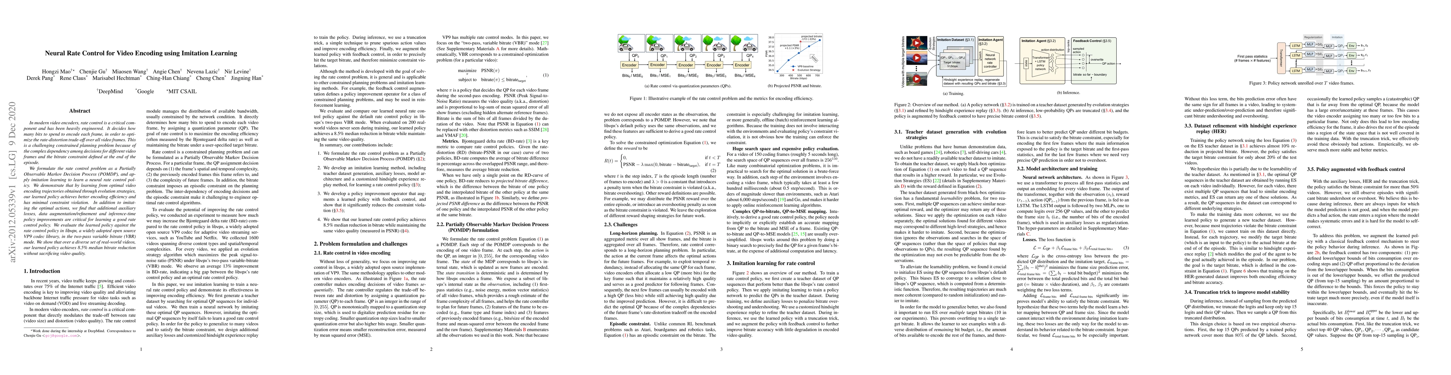 This paper proposes a neural rate control policy for video encoding using imitation learning, formulated as a POMDP. The learned policy, trained on optimal trajectories, achieves 8.5% median bitrate reduction in real-world videos compared to libvpx's rate control, without compromising video quality.