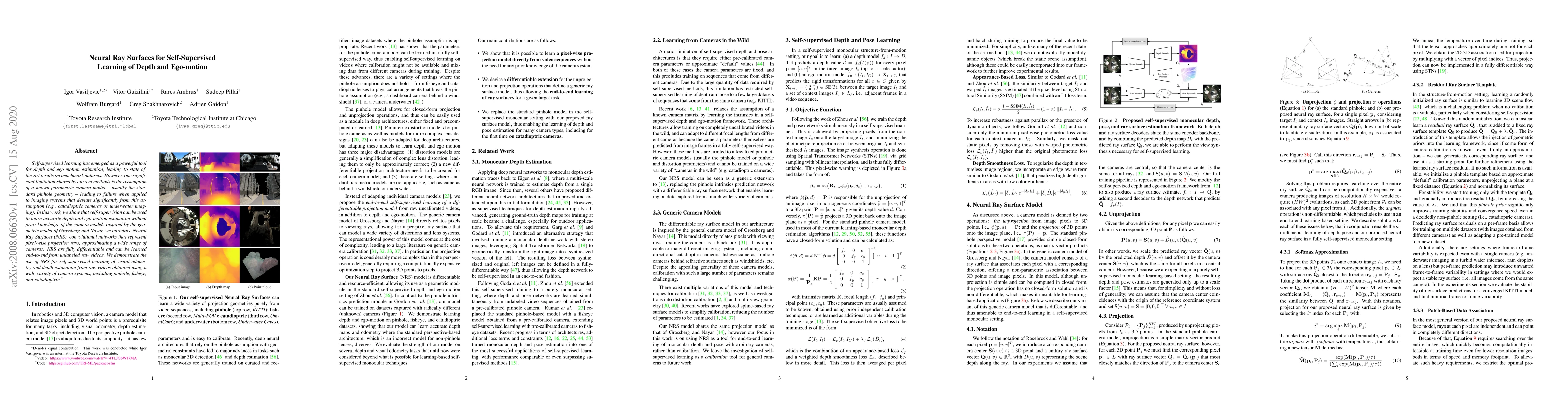This paper proposes Neural Ray Surfaces (NRS) for self-supervised learning of depth and ego-motion estimation without requiring a known camera model. NRS approximates diverse camera geometries and allows for end-to-end training from unlabeled videos, achieving state-of-the-art results across various camera types.