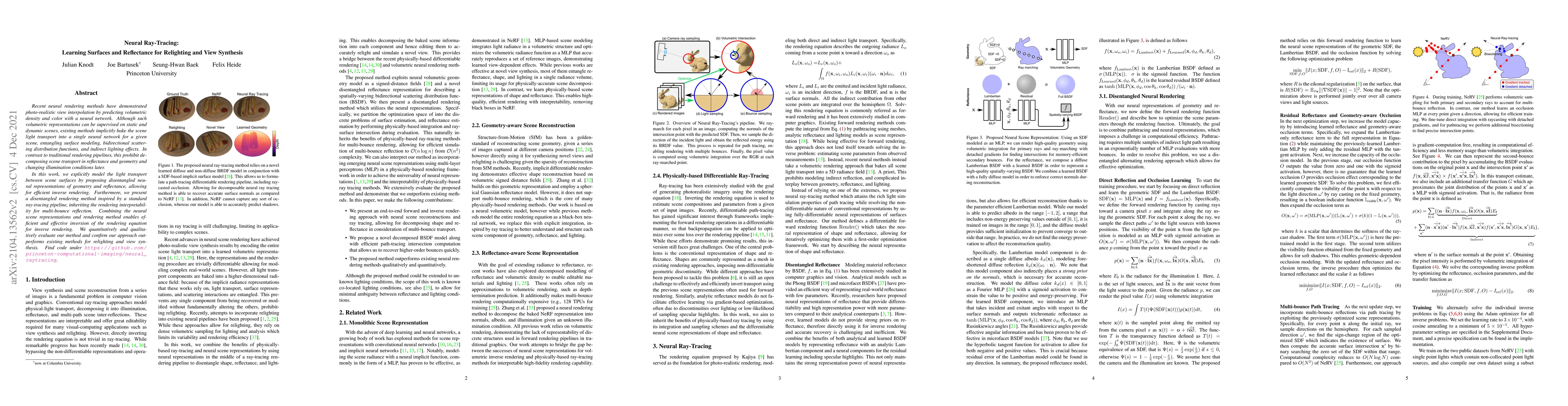This paper proposes a neural ray-tracing method that explicitly models light transport between scene surfaces, enabling editing of shape, reflectance, lighting, and scene composition. The method outperforms NeRV for relighting and produces realistic reconstructions, validated on synthetic and real datasets.