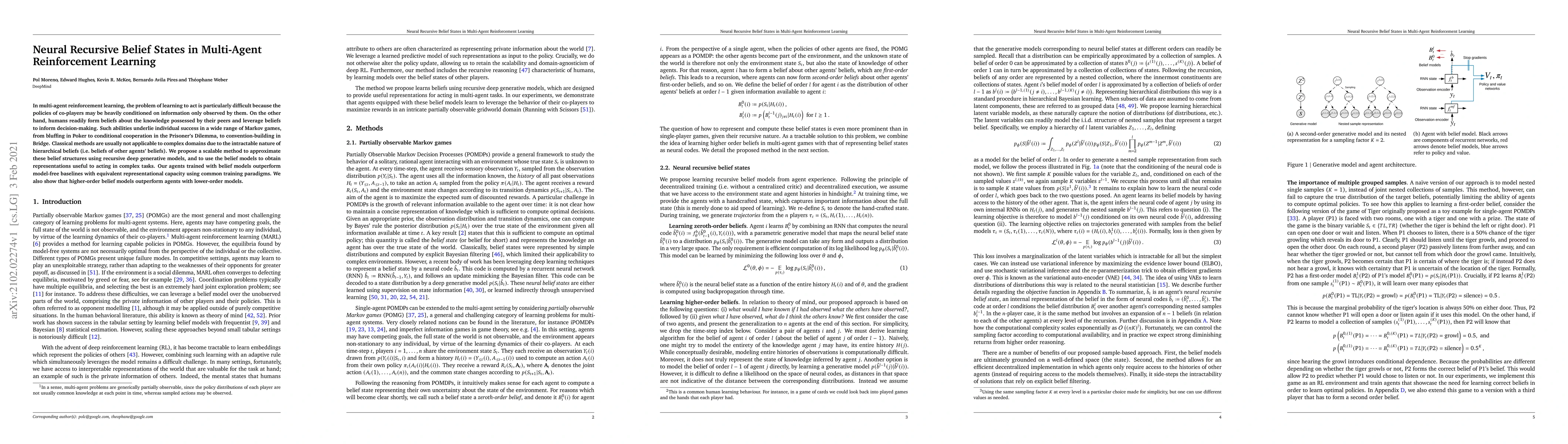 In multi-agent reinforcement learning, the problem of learning to act is particularly difficult because the policies of co-players may be heavily conditioned on information only observed by them. On the other hand, humans readily form beliefs about the knowledge possessed by their peers and leverage beliefs to inform decision-making. Such abilities underlie individual success in a wide range of Markov games, from bluffing in Poker to conditional cooperation in the Prisoner's Dilemma, to convention-building in Bridge. Classical methods are usually not applicable to complex domains due to the intractable nature of hierarchical beliefs (i.e. beliefs of other agents' beliefs). We propose a scalable method to approximate these belief structures using recursive deep generative models, and to use the belief models to obtain representations useful to acting in complex tasks. Our agents trained with belief models outperform model-free baselines with equivalent representational capacity using common training paradigms. We also show that higher-order belief models outperform agents with lower-order models.