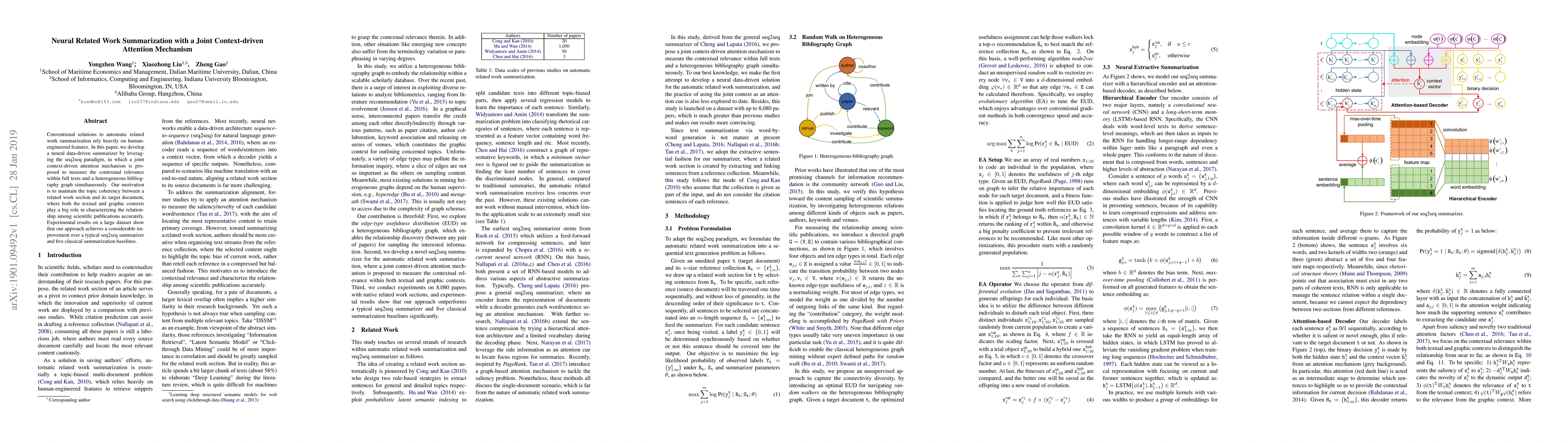 Conventional solutions to automatic related work summarization rely heavily on human-engineered features. In this paper, we develop a neural data-driven summarizer by leveraging the seq2seq paradigm, in which a joint context-driven attention mechanism is proposed to measure the contextual relevance within full texts and a heterogeneous bibliography graph simultaneously. Our motivation is to maintain the topic coherency between a related work section and its target document, where both the textual and graphic contexts play a big role in characterizing the relationship among scientific publications accurately. Experimental results on a large dataset show that our approach achieves a considerable improvement over a typical seq2seq summarizer and five classical summarization baselines.