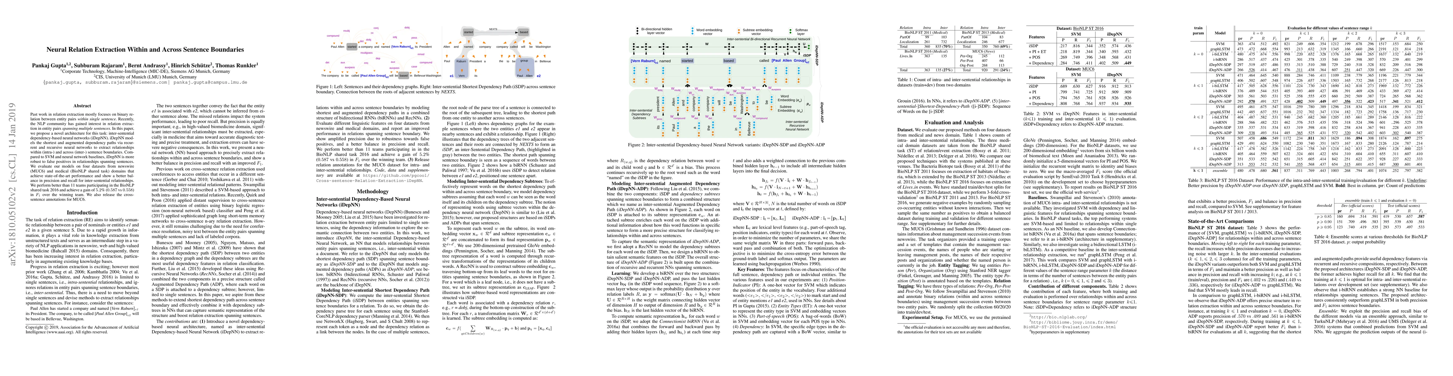 This paper introduces iDepNN, a neural network architecture for extracting relations within and across sentences, outperforming traditional SVM and neural network baselines. The model achieves state-of-the-art results on newswire and medical datasets, demonstrating improved precision and recall for inter-sentential relationships.
