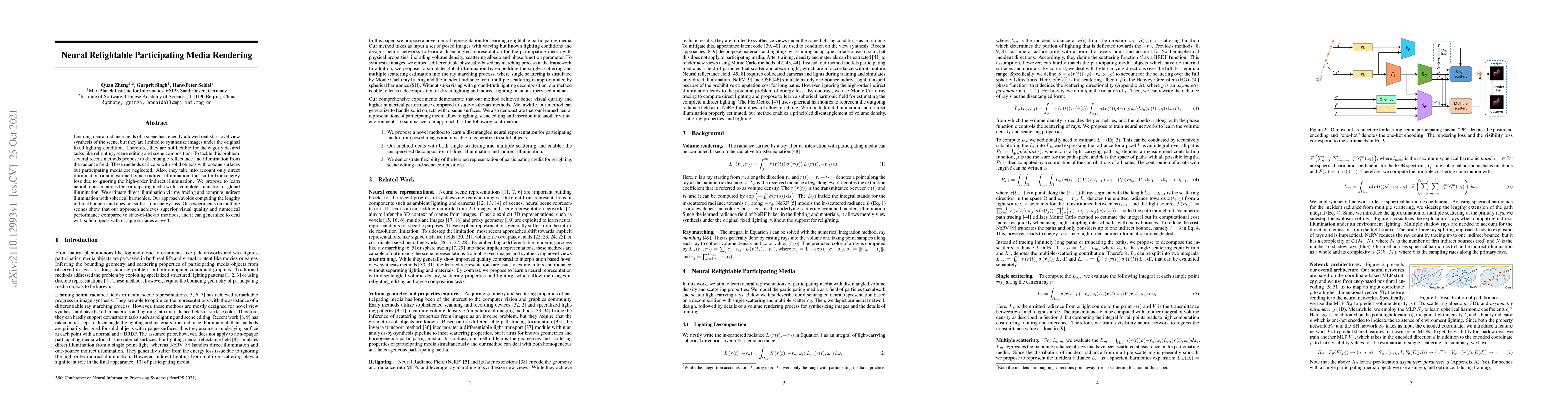 This paper proposes a method to render participating media using neural radiance fields that simulate global illumination, enabling realistic relighting and scene editing. It achieves superior visual quality and performance over existing methods by estimating direct and indirect illumination without energy loss.