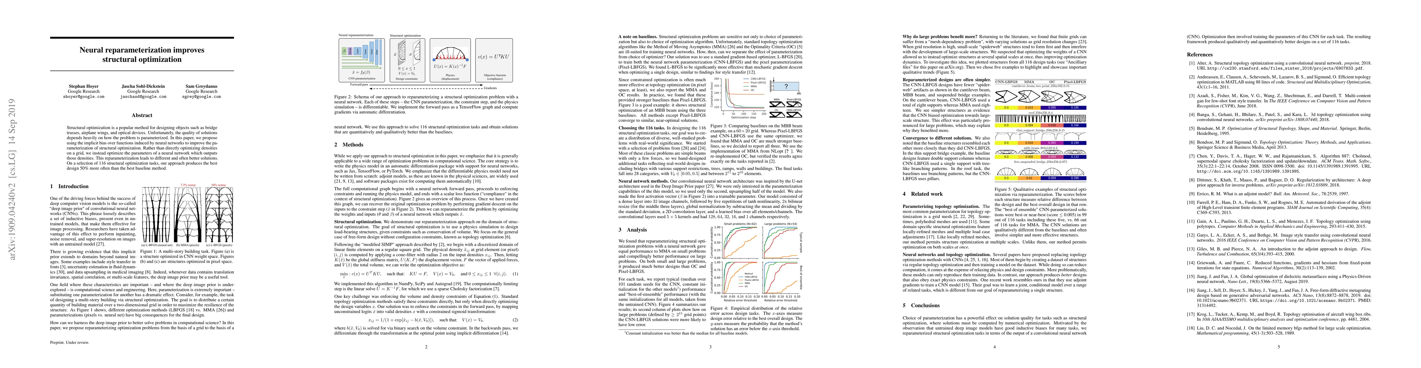 This paper proposes a neural reparameterization technique to enhance structural optimization, optimizing neural network parameters instead of densities directly, resulting in superior design solutions 50% more often than traditional methods on a set of 116 tasks.