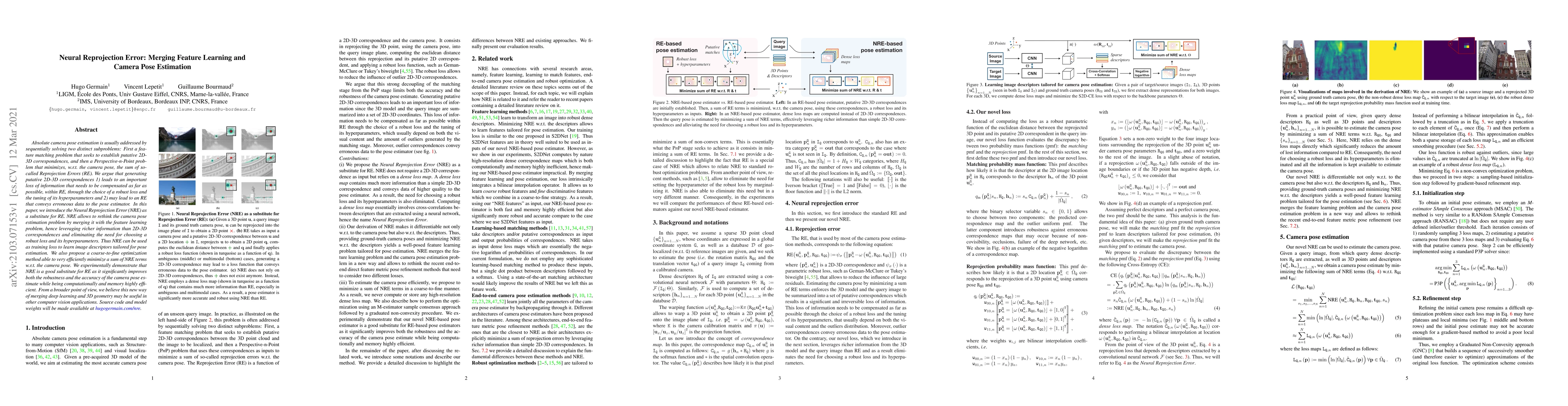 This paper proposes the Neural Reprojection Error (NRE) to merge feature learning and camera pose estimation, eliminating the need for separate feature matching and minimizing reprojection errors. NRE improves pose estimation robustness and accuracy while being computationally efficient.