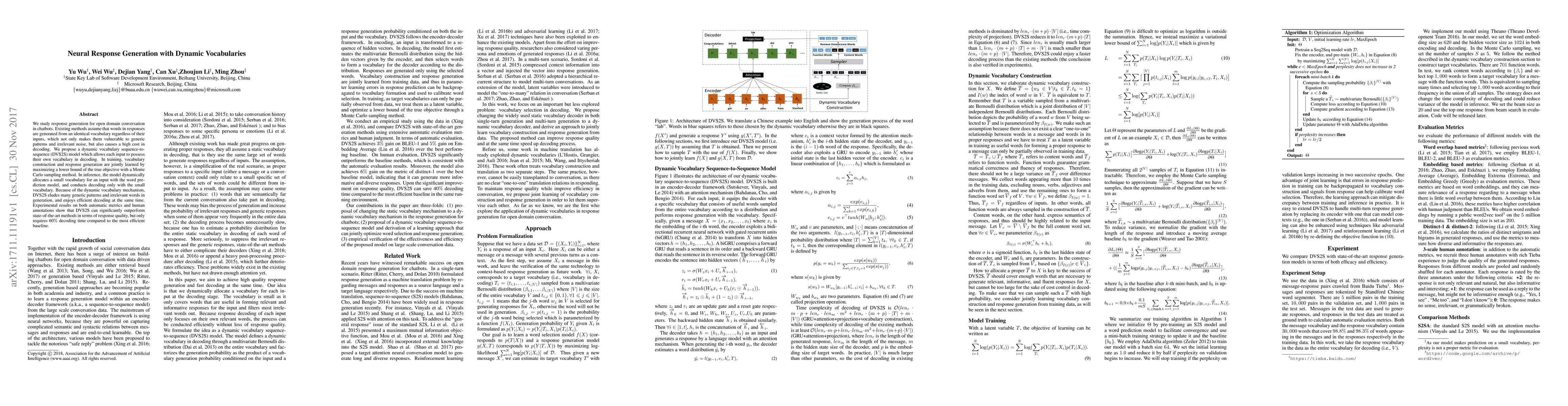 This paper proposes a dynamic vocabulary sequence-to-sequence (DVS2S) model for open domain chatbot response generation, which allows each input to have its own vocabulary, improving response quality and reducing decoding time. Experimental results show DVS2S outperforms existing methods while requiring only 60% of the decoding time.