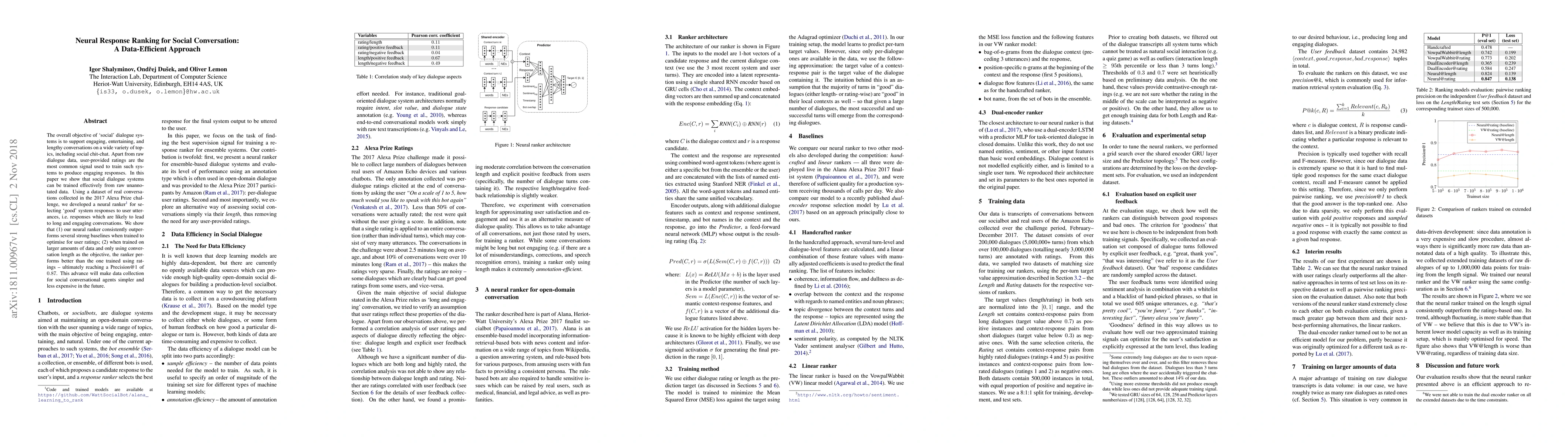 Researchers developed a neural ranker to train social conversation systems from raw unannotated data, outperforming strong baselines with high Precision@1 scores of up to 0.87.