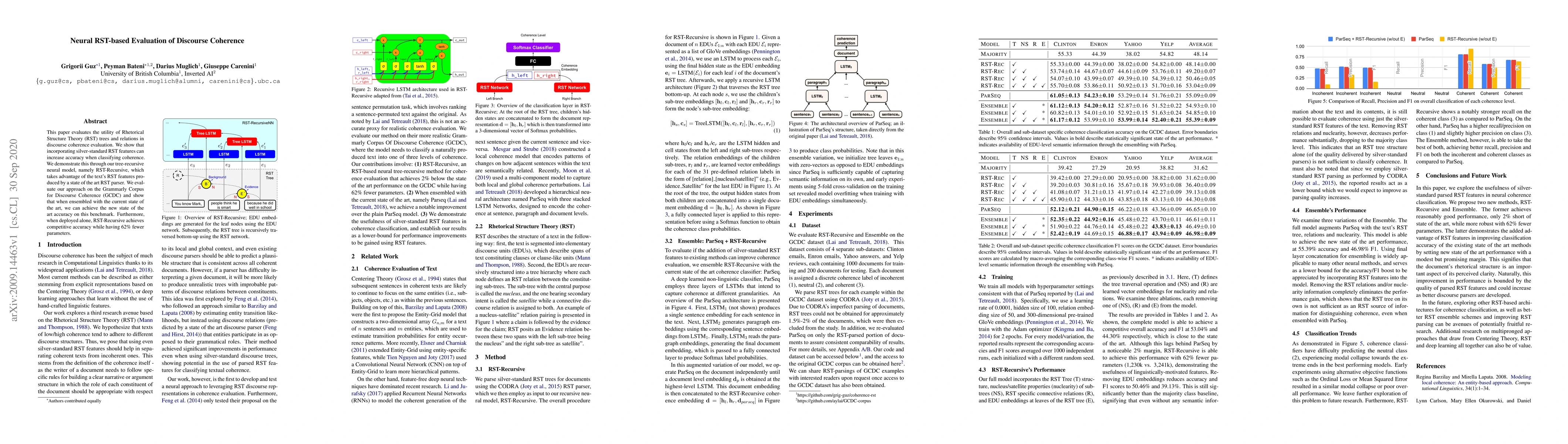 This paper introduces RST-Recursive, a neural model that leverages Rhetorical Structure Theory (RST) features to evaluate discourse coherence, achieving state-of-the-art accuracy on the Grammarly Corpus for Discourse Coherence (GCDC) when ensembled with existing methods, and competitive accuracy with fewer parameters when used alone.