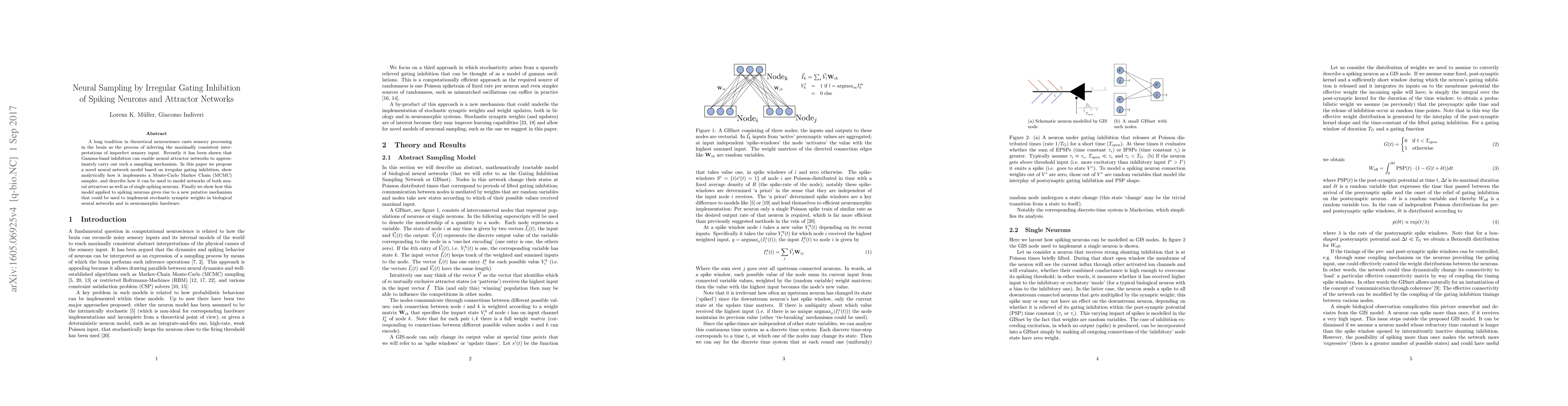 This paper proposes a novel neural network model utilizing irregular gating inhibition to implement a Monte-Carlo Markov Chain (MCMC) sampler, enabling neural attractor networks and spiking neurons to perform neural sampling. It suggests a potential mechanism for stochastic synaptic weights in biological and neuromorphic systems.