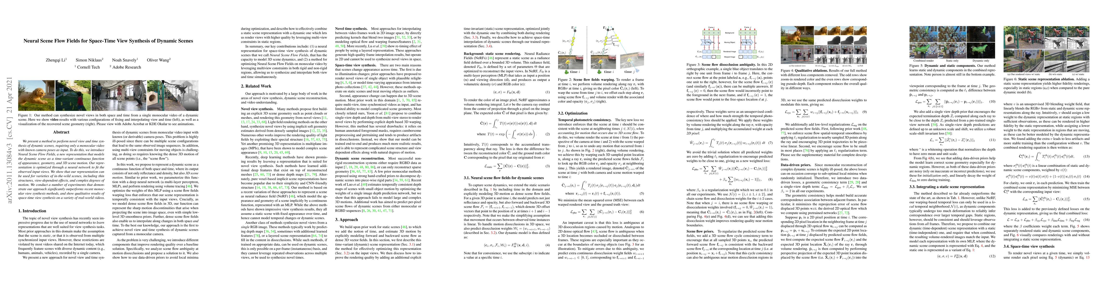 This research introduces Neural Scene Flow Fields to synthesize novel views and times in dynamic scenes using only a monocular video with known camera poses. The proposed method outperforms recent monocular view synthesis techniques and provides effective results for complex scenes with thin structures and natural motion.