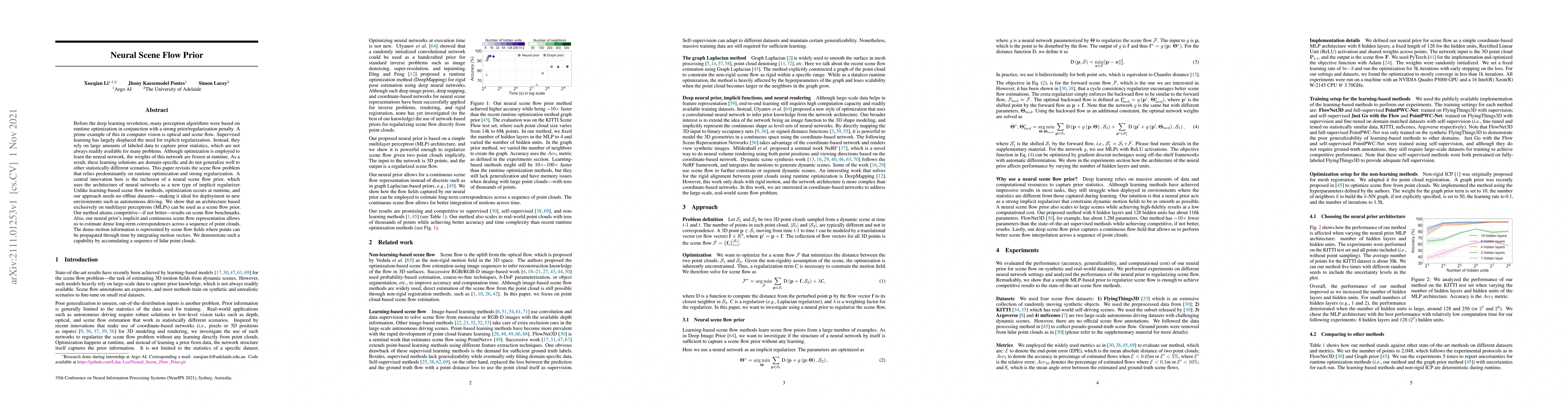 This paper proposes a neural scene flow prior using multilayer perceptrons as an implicit regularizer for scene flow optimization, enabling runtime adaptation without requiring large labeled datasets. The method achieves competitive results on benchmarks and allows for dense long-term correspondence estimation across point cloud sequences.