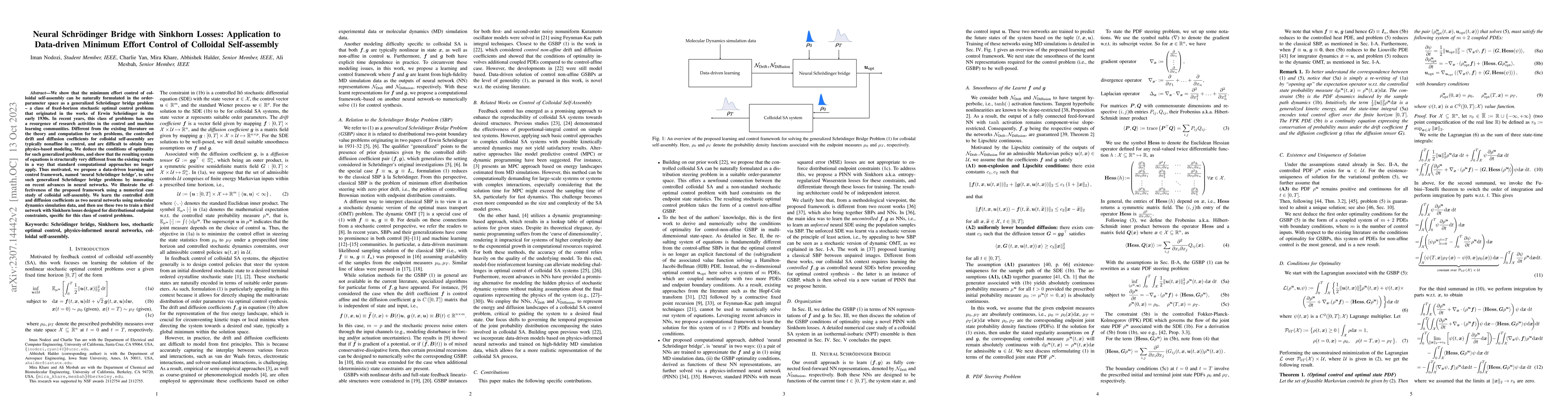 We show that the minimum effort control of colloidal self-assembly can be naturally formulated in the order-parameter space as a generalized Schr\"{o}dinger bridge problem -- a class of fixed-horizon stochastic optimal control problems that originated in the works of Erwin Schr\"{o}dinger in the early 1930s. In recent years, this class of problems has seen a resurgence of research activities in the control and machine learning communities. Different from the existing literature on the theory and computation for such problems, the controlled drift and diffusion coefficients for colloidal self-assembly are typically nonaffine in control, and are difficult to obtain from physics-based modeling. We deduce the conditions of optimality for such generalized problems, and show that the resulting system of equations is structurally very different from the existing results in a way that standard computational approaches no longer apply. Thus motivated, we propose a data-driven learning and control framework, named `neural Schr\"{o}dinger bridge', to solve such generalized Schr\"{o}dinger bridge problems by innovating on recent advances in neural networks. We illustrate the effectiveness of the proposed framework using a numerical case study of colloidal self-assembly. We learn the controlled drift and diffusion coefficients as two neural networks using molecular dynamics simulation data, and then use these two to train a third network with Sinkhorn losses designed for distributional endpoint constraints, specific for this class of control problems.