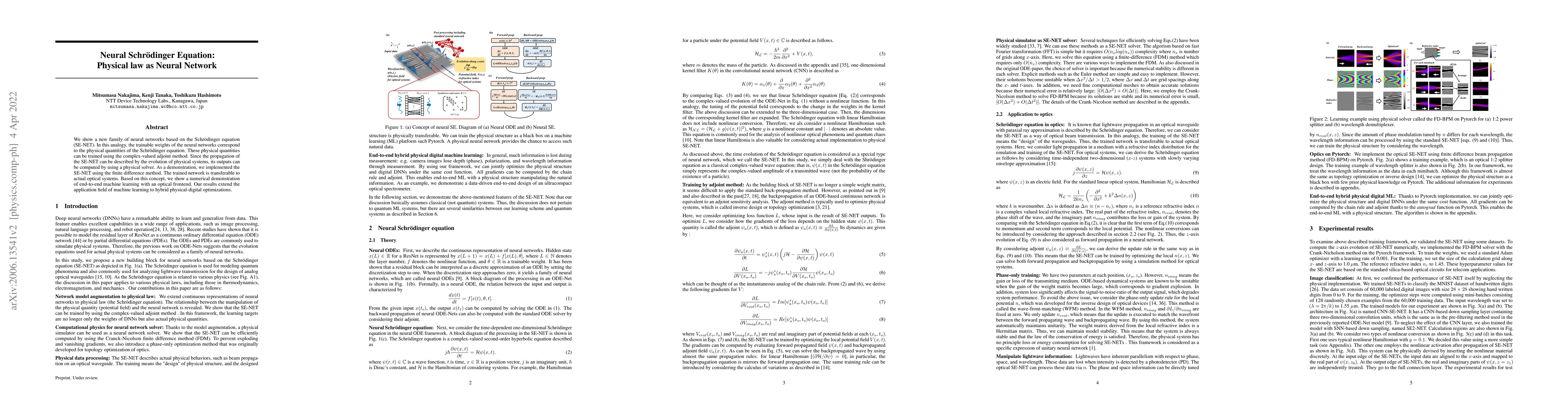 This paper introduces SE-NET, a novel neural network framework based on the Schrödinger equation, where trainable weights correspond to physical quantities. The network's propagation is computed using a physical solver, demonstrating its application in optical systems and enabling hybrid physical-digital optimizations.