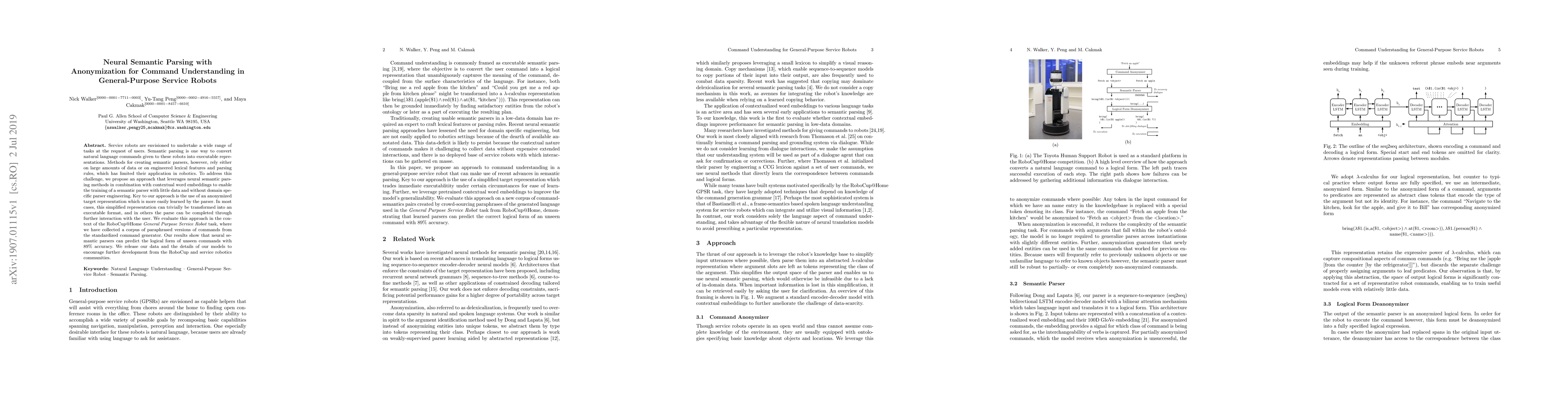 Service robots are envisioned to undertake a wide range of tasks at the request of users. Semantic parsing is one way to convert natural language commands given to these robots into executable representations. Methods for creating semantic parsers, however, rely either on large amounts of data or on engineered lexical features and parsing rules, which has limited their application in robotics. To address this challenge, we propose an approach that leverages neural semantic parsing methods in combination with contextual word embeddings to enable the training of a semantic parser with little data and without domain specific parser engineering. Key to our approach is the use of an anonymized target representation which is more easily learned by the parser. In most cases, this simplified representation can trivially be transformed into an executable format, and in others the parse can be completed through further interaction with the user. We evaluate this approach in the context of the RoboCup@Home General Purpose Service Robot task, where we have collected a corpus of paraphrased versions of commands from the standardized command generator. Our results show that neural semantic parsers can predict the logical form of unseen commands with 89% accuracy. We release our data and the details of our models to encourage further development from the RoboCup and service robotics communities.