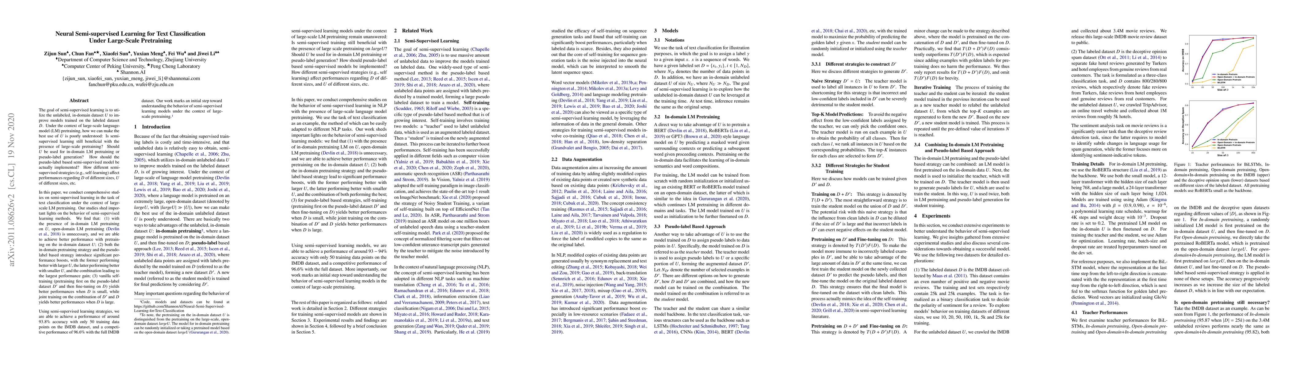 This paper investigates semi-supervised learning methods for text classification under large-scale language model pretraining, finding that in-domain pretraining and pseudo-label strategies both significantly enhance performance, with the best results achieved through their combination. The study reveals that self-training works best with limited labeled data, while joint training is more effective with larger labeled datasets.