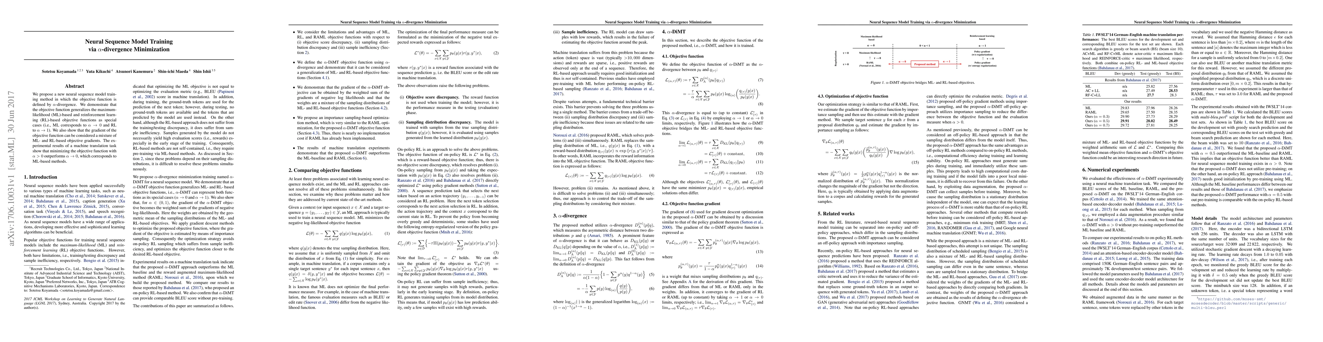 This paper introduces a novel neural sequence model training method using $\alpha$-divergence minimization, which generalizes both maximum-likelihood and reinforcement learning objectives. Experimental results on machine translation indicate that $\alpha > 0$ yields better performance compared to traditional maximum-likelihood methods.