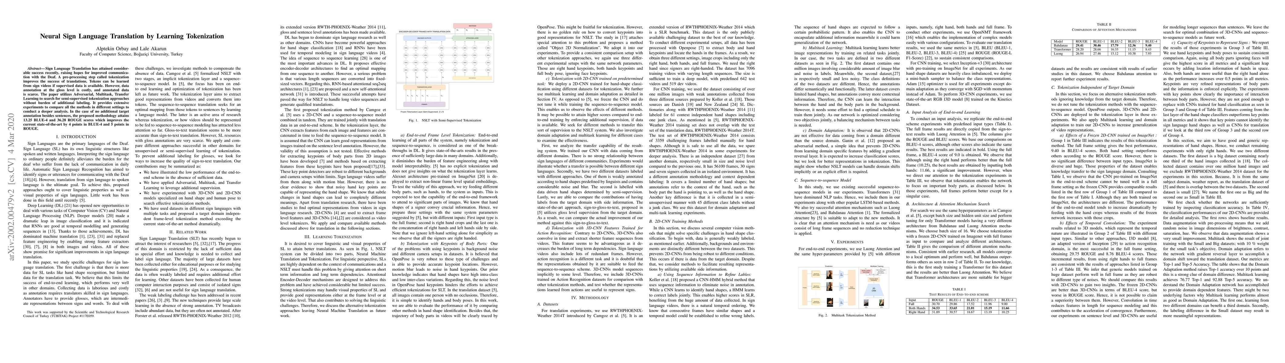This paper explores semi-supervised tokenization for neural sign language translation using Adversarial, Multitask, and Transfer Learning, achieving state-of-the-art results with 13.25 BLUE-4 and 36.28 ROUGE scores without additional gloss-level annotation. The proposed method significantly improves translation accuracy compared to existing approaches.