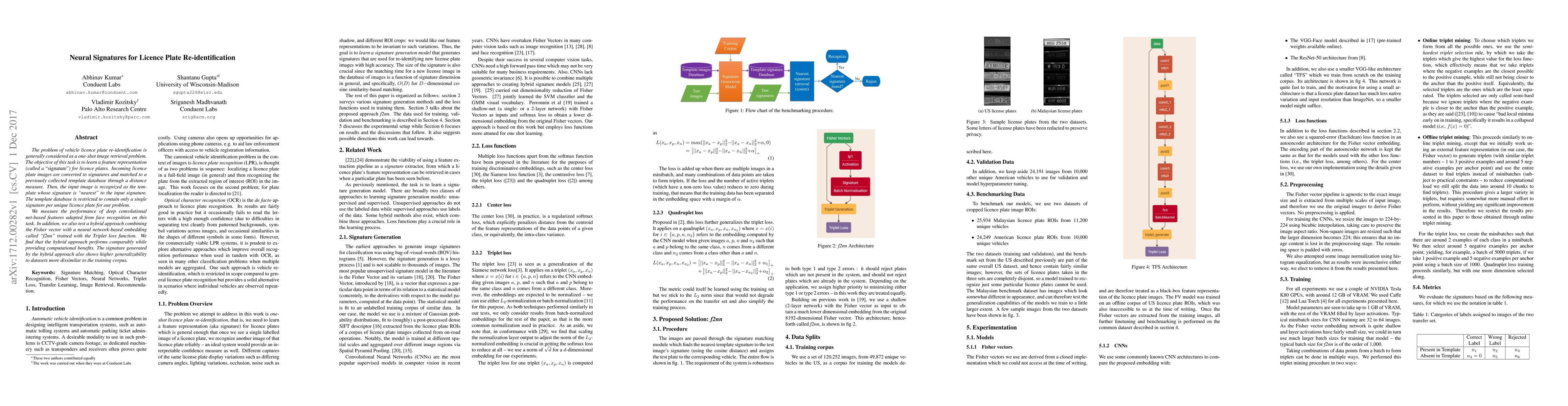 This paper explores neural signatures for vehicle licence plate re-identification using deep convolutional networks and a hybrid approach combining Fisher vectors with neural network embeddings. The hybrid method shows comparable performance and better generalizability to dissimilar datasets.
