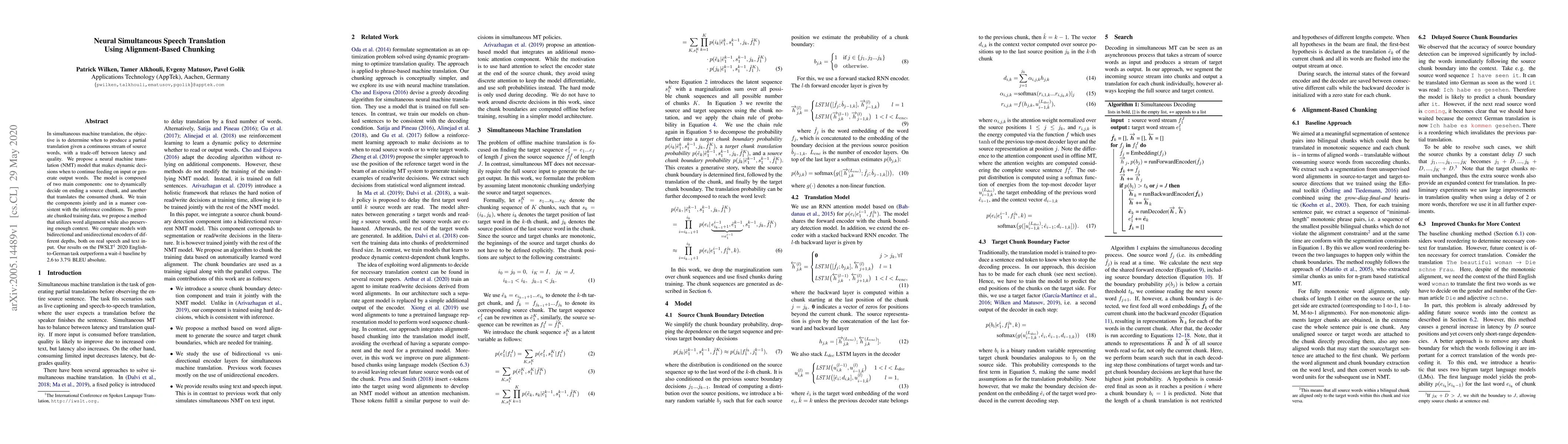 In simultaneous machine translation, the objective is to determine when to produce a partial translation given a continuous stream of source words, with a trade-off between latency and quality. We propose a neural machine translation (NMT) model that makes dynamic decisions when to continue feeding on input or generate output words. The model is composed of two main components: one to dynamically decide on ending a source chunk, and another that translates the consumed chunk. We train the components jointly and in a manner consistent with the inference conditions. To generate chunked training data, we propose a method that utilizes word alignment while also preserving enough context. We compare models with bidirectional and unidirectional encoders of different depths, both on real speech and text input. Our results on the IWSLT 2020 English-to-German task outperform a wait-k baseline by 2.6 to 3.7% BLEU absolute.