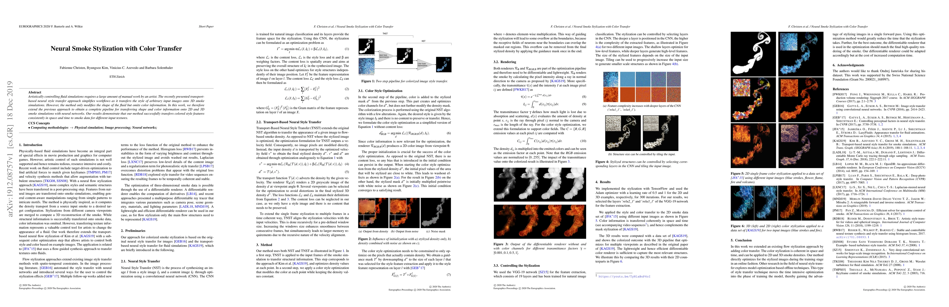 This paper presents a neural network method to transfer both shape and color information from input images to 3D smoke simulations, enhancing the artistic control over fluid simulations. The proposed approach successfully applies colored style features consistently across time and space to various smoke textures.