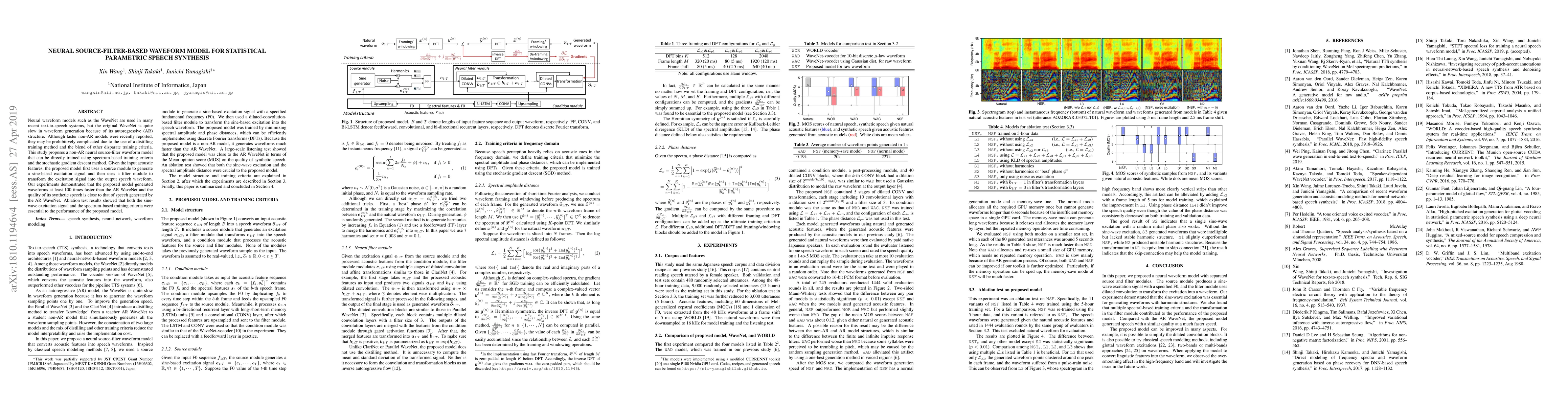 Neural waveform models such as the WaveNet are used in many recent text-to-speech systems, but the original WaveNet is quite slow in waveform generation because of its autoregressive (AR) structure. Although faster non-AR models were recently reported, they may be prohibitively complicated due to the use of a distilling training method and the blend of other disparate training criteria. This study proposes a non-AR neural source-filter waveform model that can be directly trained using spectrum-based training criteria and the stochastic gradient descent method. Given the input acoustic features, the proposed model first uses a source module to generate a sine-based excitation signal and then uses a filter module to transform the excitation signal into the output speech waveform. Our experiments demonstrated that the proposed model generated waveforms at least 100 times faster than the AR WaveNet and the quality of its synthetic speech is close to that of speech generated by the AR WaveNet. Ablation test results showed that both the sine-wave excitation signal and the spectrum-based training criteria were essential to the performance of the proposed model.