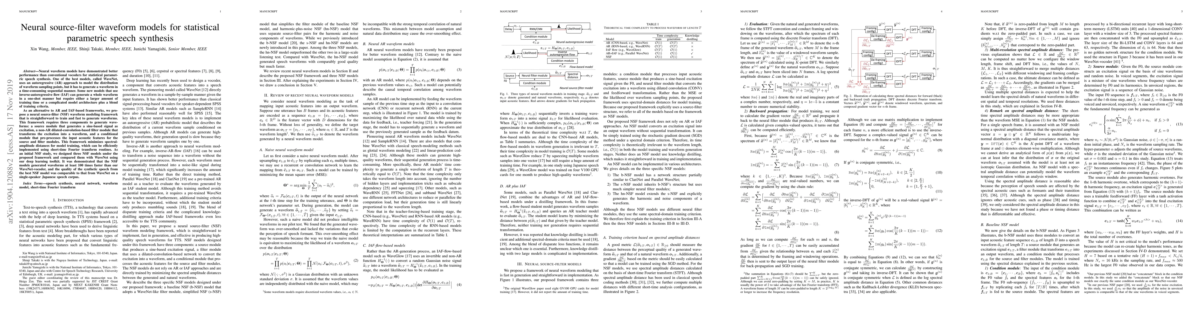 This paper proposes a neural source-filter waveform modeling framework that generates speech faster and potentially with better quality than WaveNet. The NSF models use a source module, a non-AR dilated-convolution filter, and a conditional preprocessing module, achieving faster training and synthesis speeds without sacrificing speech quality.