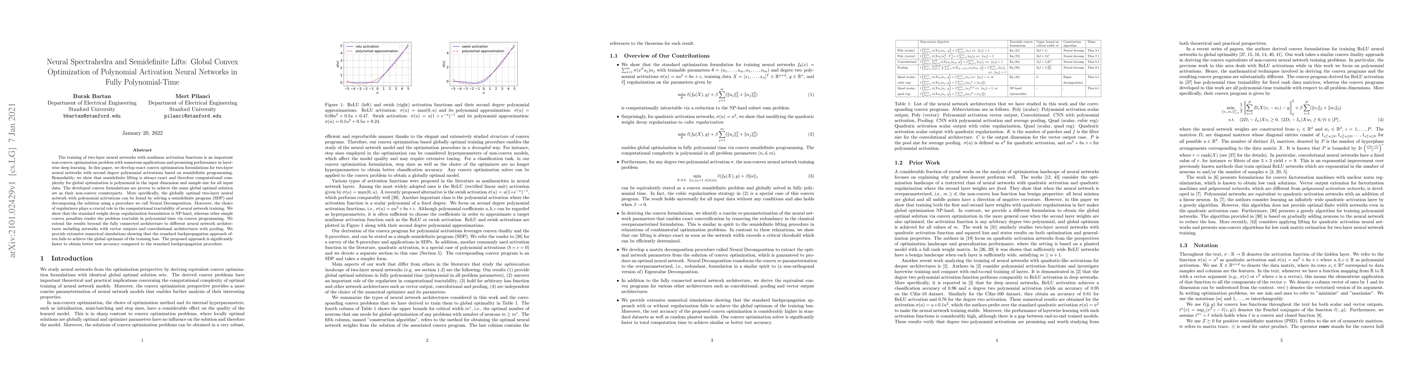 This paper develops exact convex optimization formulations for training two-layer neural networks with polynomial activations using semidefinite programming, proving that semidefinite lifting is exact and polynomial-time solvable. It shows that the proposed method, involving Neural Decomposition, outperforms standard backpropagation in achieving global optima and achieving better test accuracy.