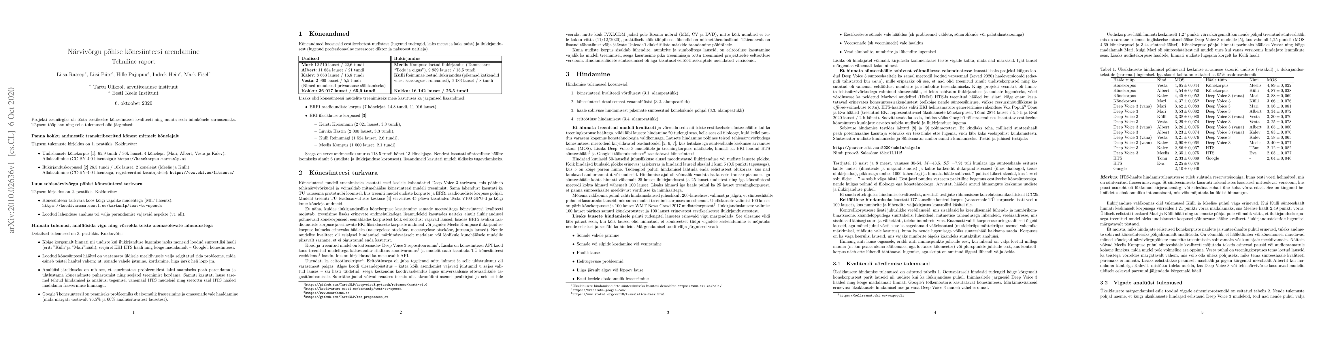 This technical report describes the results of a collaboration between the NLP research group at the University of Tartu and the Institute of Estonian Language on improving neural speech synthesis for Estonian. The report (written in Estonian) describes the project results, the summary of which is: (1) Speech synthesis data from 6 speakers for a total of 92.4 hours is collected and openly released (CC-BY-4.0). Data available at https://konekorpus.tartunlp.ai and https://www.eki.ee/litsents/. (2) software and models for neural speech synthesis is released open-source (MIT license). Available at https://koodivaramu.eesti.ee/tartunlp/text-to-speech . (3) We ran evaluations of the new models and compared them to other existing solutions (HMM-based HTS models from EKI, http://www.eki.ee/heli/, and Google's speech synthesis for Estonian, accessed via https://translate.google.com). Evaluation includes voice acceptability MOS scores for sentence-level and longer excerpts, detailed error analysis and evaluation of the pre-processing module.