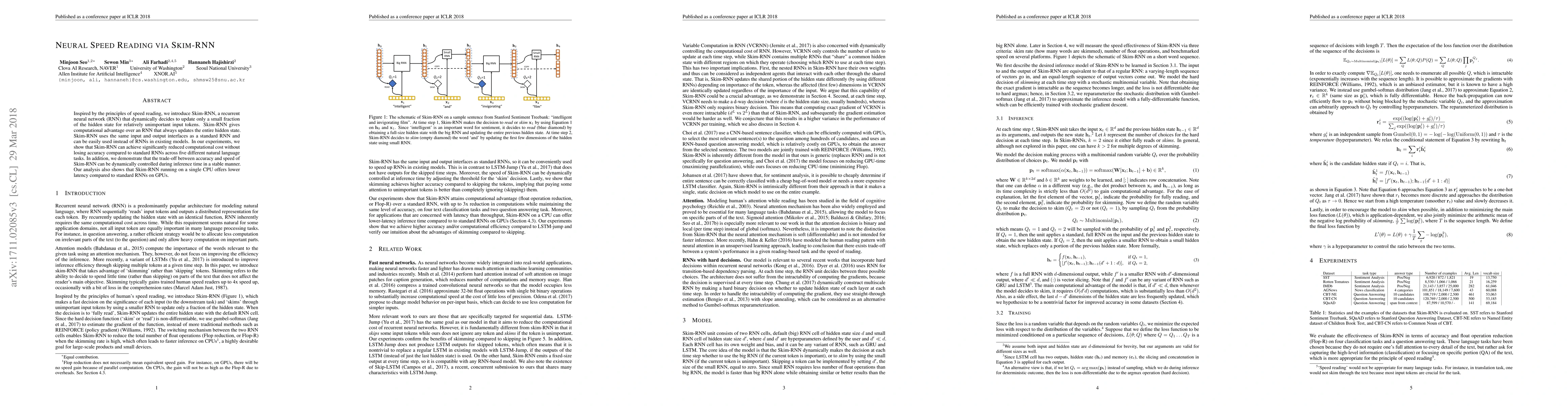 Skim-RNN dynamically updates only a fraction of its hidden state for less important input tokens, significantly reducing computational cost without sacrificing accuracy in natural language tasks. The model allows dynamic control over the trade-off between speed and accuracy and offers lower latency than standard RNNs on CPUs.