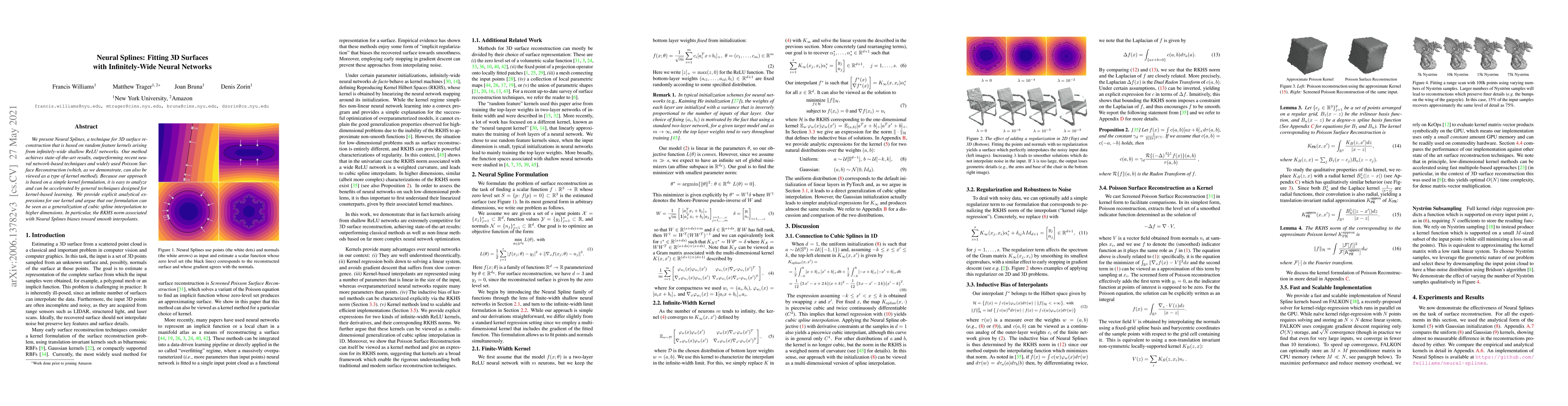 Neural Splines reconstructs 3D surfaces using infinitely-wide neural networks that function as random feature kernels, achieving superior results compared to other neural and traditional methods. This approach is analytically tractable and generalizes cubic spline interpolation to higher dimensions, favoring smooth surface interpolants.