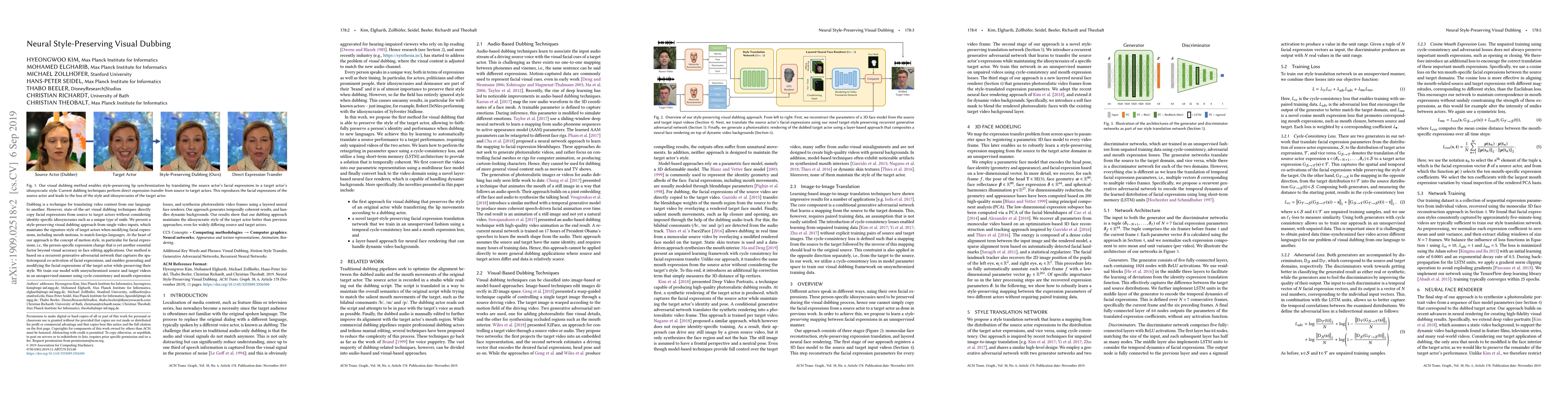This paper introduces a style-preserving visual dubbing method that maintains target actors' unique facial expression styles while translating video content to different languages. The approach uses a recurrent generative adversarial network to capture and replicate the motion style of facial expressions, trained in an unsupervised manner to generate temporally coherent and photorealistic video frames.